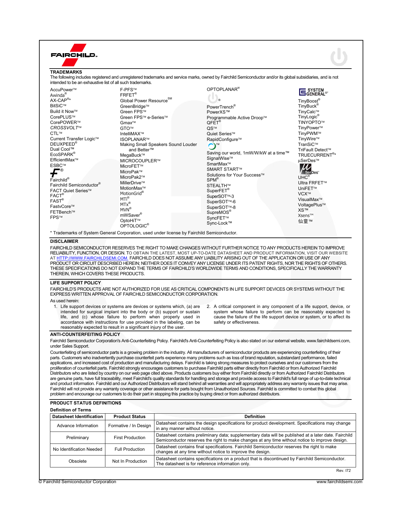 Fairchild Semiconductor Corporation's Anti-Counterfeiting Policy. Fairchild's Anti-Counterfeiting Policy is also stated on our external website, www.fairchildsemi.com,