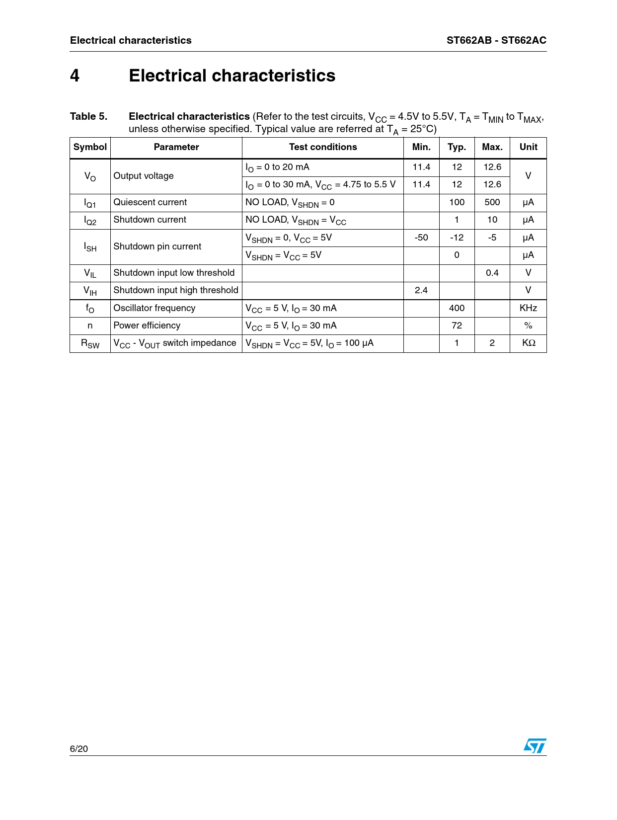Electrical characteristicsST662AB - ST662AC4 ElectricalcharacteristicsTable 5.Electrical characteristics (Refer to the test circuits, VCC = 4.5V to 5.5V, TA = TMIN to TMAX, unless otherwise specified. Typical value are referred at TA = 25°C) SymbolParameterTest conditionsMin.Typ.Max.Unit IO = 0 to 20 mA 11.4 12 12.6 VO Output voltage V IO = 0 to 30 mA, VCC = 4.75 to 5.5 V 11.4 12 12.6 IQ1 Quiescent current NO LOAD, VSHDN = 0 100 500 µA IQ2 Shutdown current NO LOAD, VSHDN = VCC 1 10 µA VSHDN = 0, VCC = 5V -50 -12 -5 µA ISH Shutdown pin current VSHDN = VCC = 5V 0 µA VIL Shutdown input low threshold 0.4 V VIH Shutdown input high threshold 2.4 V fO Oscillator frequency VCC = 5 V, IO = 30 mA 400 KHz n Power efficiency VCC = 5 V, IO = 30 mA 72 % RSW VCC - VOUT switch impedance VSHDN = VCC = 5V, IO = 100 µA 1 2 KΩ 6/20 Document Outline Table 1. Device summary 1 Application circuit Figure 1. Typical application circuit 2 Pin configuration Figure 2. Pin connections (top view) Table 2. Pin description 3 Maximum ratings Table 3. Absolute maximum ratings Table 4. Thermal data 4 Electrical characteristics Table 5. Electrical characteristics (Refer to the test circuits, VCC = 4.5V to 5.5V, TA = TMIN to TMAX, unless otherwise specified. Typical value are referred at TA = 25˚C) 5 Typical performance characteristics Figure 3. Output voltage vs temperature Figure 4. Output voltage vs temperature Figure 5. Supply current vs temperature Figure 6. Supply current vs supply voltage Figure 7. SHDN pin current vs temperature Figure 8. Output voltage vs shutdown input Figure 9. Output voltage vs shutdown input voltage Figure 10. Output voltage vs shutdown input voltage Figure 11. Test circuit 6 Description Figure 12. Operating principle circuit Figure 13. Exiting shutdown Figure 14. Entering shutdown 7 Application circuit Figure 15. KIT Lay-out Figure 16. Electrical schematic Table 6. List of component 7.1 ST662A output performance Figure 17. Output voltage vs output current Figure 18. Efficiency vs output current Figure 19. Load transient response Figure 20. Load transient response 8 How to increase output current or output voltage capability Figure 21. Application circuit for two ST662A in parallel Table 7. List of component Figure 22. Application circuit for output voltage greater than 12V Figure 23. Output voltage for the application with two device in parallel Figure 24. Output voltage for application with output voltage greater than 12V 9 Package mechanical data 10 Revision history Table 8. Revision history