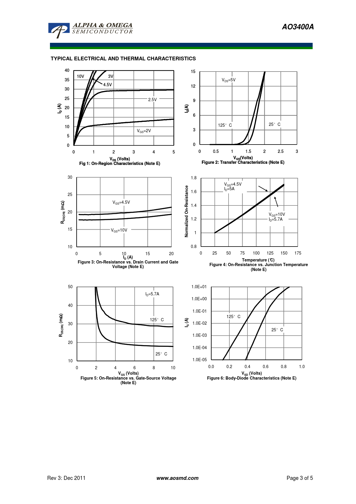 AO3400ATYPICAL ELECTRICAL AND THERMAL CHARACTERISTICS 40 15 10V 3V 35 V =5 = V DS D 4.5V 12 30 25 2.5V 9 ))(A 20 (AI DII DI 6 15 25 C ° 125 C ° 10 V =2 = V 3 GS 5 0 0 0 0.5 1 1.5 2 2.5 3 0 1 2 3 4 5 V(VoV lts)V(VoV lts)GSDSDFigurer 2: Trar nsferr ChC arar cterir stics (NoN te E)Fig 1: OnO -ReR gion ChC arar cterir stics (NoN te E)EE) 30 1.8 V =4 = .5V e GS e c I =5 = A n 1.6 D 6 25 ta is)s Ω V =4 = .5V Ω GS e Ω 1.4 -R 17 (mn) N 20 O V =1 = 5 0V (Od GS dSeD 1.2 I =5 = .7A D 2 Rliz a 10 15 V =1 = 0V GS rm o 1 N 10 0.8 0 5 10 15 20 0 25 50 75 100 125 150 175 I (A)ADTemperar turer (°C° )C 0 Figurer 3: OnO -ReR sistance vsv . DrD ar in CuC rrr er nt and GaG teFigurer 4: OnO -ReR sistance vsv . Junction Temperar turerVoV ltage (NoN te E)E 18 (NoN te E)E 50 1.0E+01 I =5.7A D 1.0E+00 40 40 1.0E-01 ) Ω ) 125 C ° 125 C (m ° (A) 30 1.0E-02 NI S(O S 25 C ° DR 1.0E-03 20 1.0E-04 25 C ° 1.0E-05 10 0.0 0.2 0.4 0.6 0.8 1.0 0 2 4 6 8 10 V(Volts)V(Volts)GSSDFigure 5: On-Resistance vs. Gate-Source VoltageFigure 6: Body-Diode Characteristics (Note E)(Note E) Rev 3: Dec 2011 www.aosmd.com Page 3 of 5
