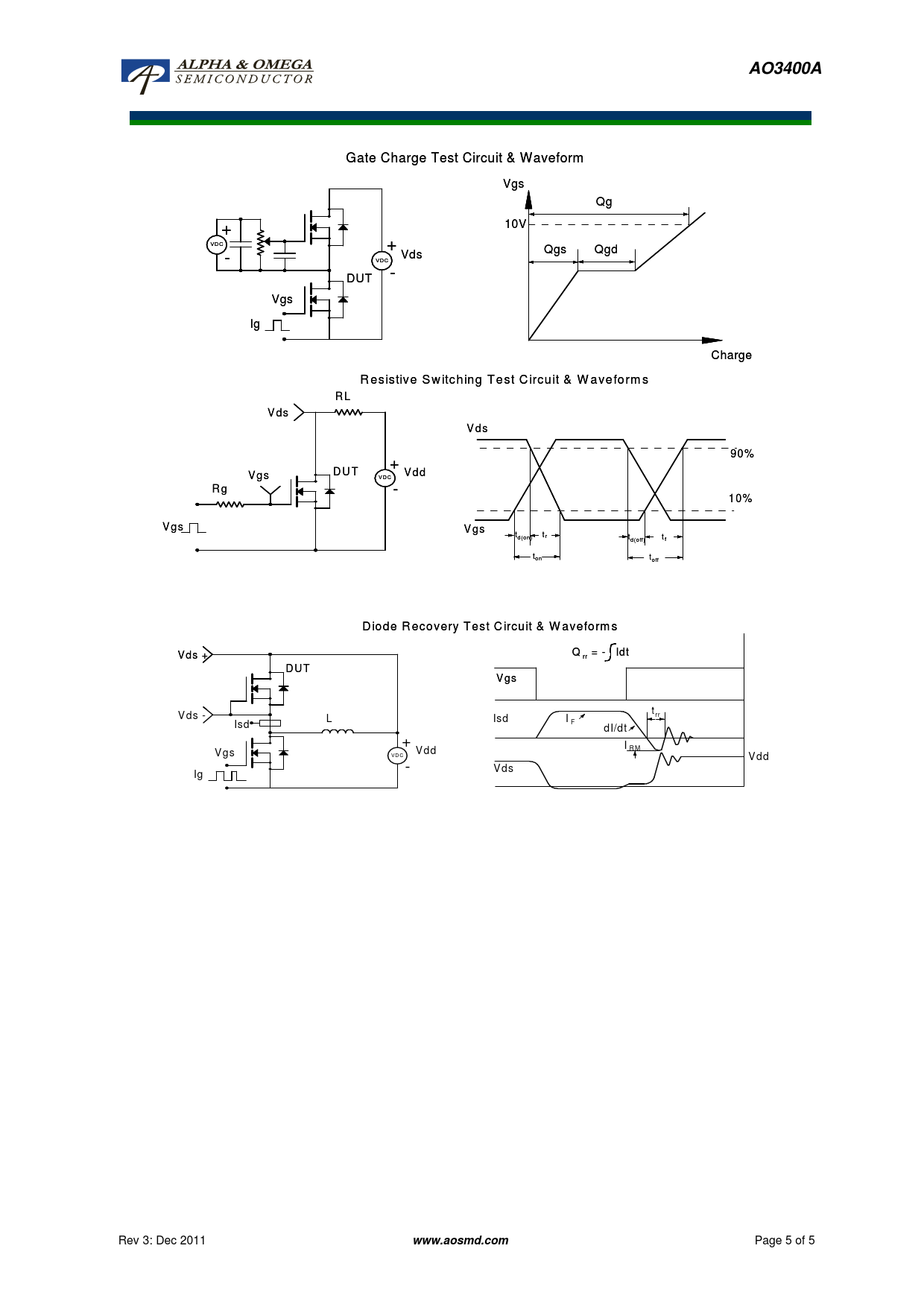 AO3400A Gate Charge Test Circuit & Waveform Vgs Qg + 10V + VDC + Qgs Qgd Vds VDC - - DUT Vgs Ig Charge R e s istiv e S w itch in g T e st C ircu it & W a ve fo rm s R L V ds V d s 90 % + D U T V d d V g s V g V D C R g - 1 0% V g s V gs t t r d (o n ) d (o n t t d (o ff) f ton toff D io d e R eco very T est C ircu it & W a vefo rm s V ds + Q = - Idt + rr D U T V gs t V ds - L Isd I rr Isd F dI/dt + I V gs R M V dd VD C V dd - V ds Ig Rev 3: Dec 2011 www.aosmd.com Page 5 of 5
