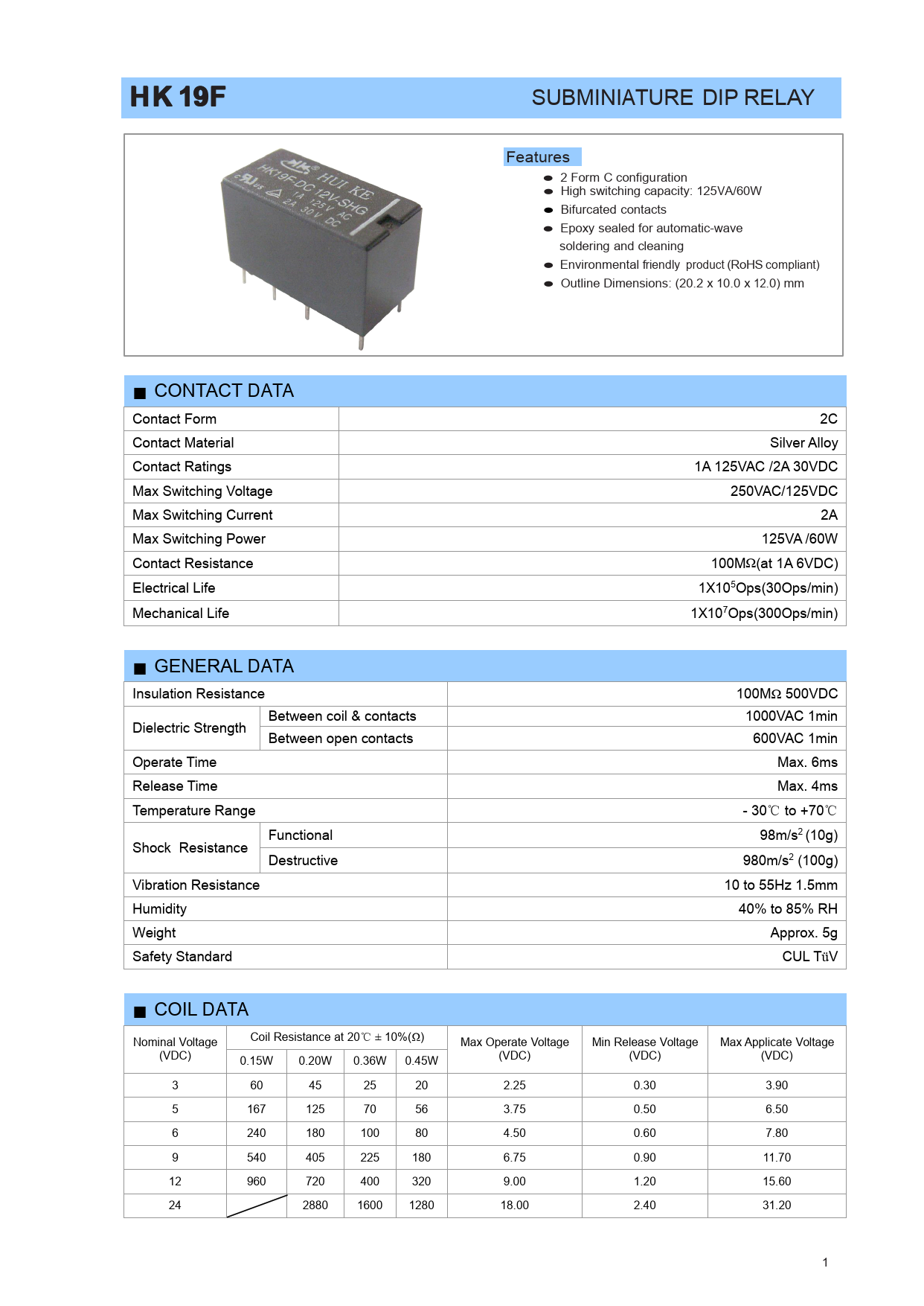H K 191 F SUBMINIATURE DIP RELAY Features ● 2 Form C configuration ● High switching capacity: 125VA/60W ● Bifurcated contacts ● Epoxy sealed for automatic-wave soldering and cleaning ● Environmental friendly product (RoHS compliant) ● Outline Dimensions: (20.2 x 10.0 x 12.0) mm ■ CONTACT DATA Contact Form 2C Contact Material Silver Alloy Contact Ratings 1A 125VAC /2A 30VDC Max Switching Voltage 250VAC/125VDC Max Switching Current 2A Max Switching Power 125VA /60W Contact Resistance 100MΩ(at 1A 6VDC) Electrical Life 1X105Ops(30Ops/min) Mechanical Life 1X107Ops(300Ops/min) ■ GENERAL DATA Insulation Resistance 100MΩ 500VDC Between coil & contacts 1000VAC 1min Dielectric Strength Between open contacts 600VAC 1min Operate Time Max. 6ms Release Time Max. 4ms Temperature Range - 30℃ to +70℃ Functional 98m/s2 (10g) Shock Resistance Destructive 980m/s2 (100g) Vibration Resistance 10 to 55Hz 1.5mm Humidity 40% to 85% RH Weight Approx. 5g Safety Standard CUL TüV ■ COIL DATA Nominal Voltage Coil Resistance at 20℃ ± 10%(Ω) Max Operate Voltage Min Release Voltage Max Applicate Voltage (VDC) (VDC) (VDC) (VDC) 0.15W 0.20W 0.36W 0.45W 3 60 45 25 20 2.25 0.30 3.90 5 167 125 70 56 3.75 0.50 6.50 6 240 180 100 80 4.50 0.60 7.80 9 540 405 225 180 6.75 0.90 11.70 12 960 720 400 320 9.00 1.20 15.60 24 2880 1600 1280 18.00 2.40 31.20 1