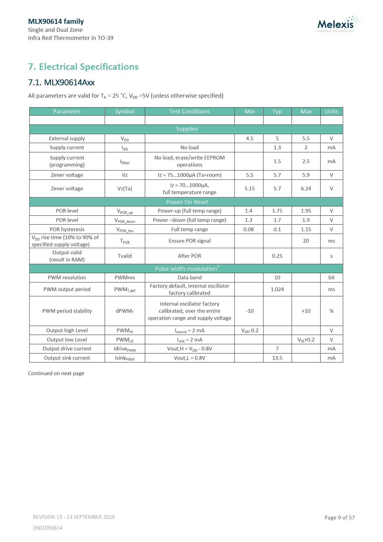 Páginas / Página57 / 9 — MLX90614 family. 7. Electrical Specifications