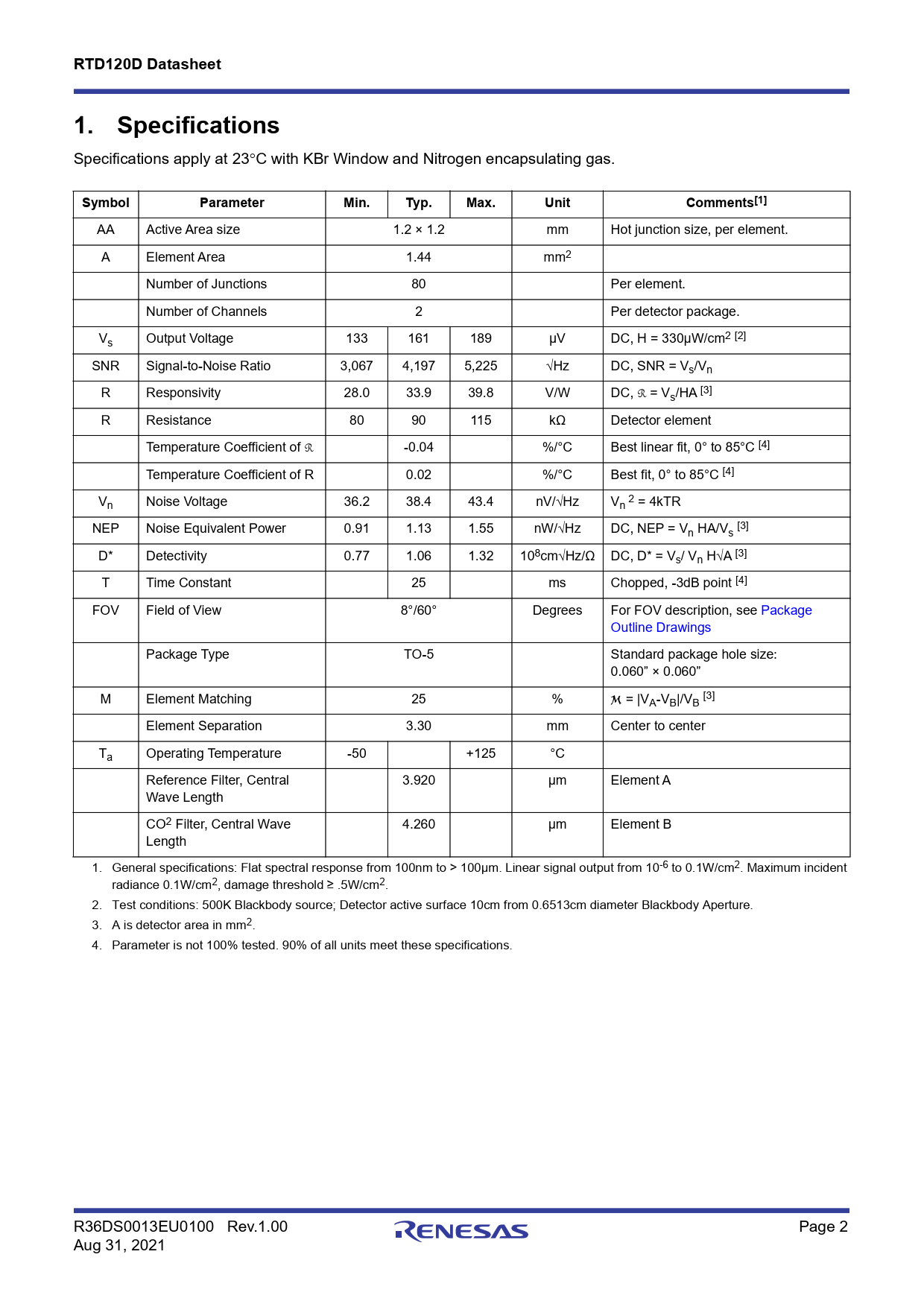 AA Active Area size 1.2 × 1.2 mm Hot junction size, per element. A Element Area 1.44 mm2 Number of Junctions 80 Per element. Number of Channels 2 Per detector package. Vs Output Voltage 133 161 189 µV DC, H = 330µW/cm2 [2] SNR Signal-to-Noise Ratio 3,067 4,197 5,225 √Hz DC, SNR = Vs/Vn R Responsivity 28.0 33.9 39.8 V/W DC, R = Vs/HA [3] R Resistance 80 90 115 kΩ Detector element Temperature Coef icient of R -0.04 %/°C Best linear fit, 0° to 85°C [4] Temperature Coef icient of R 0.02 %/°C Best fit, 0° to 85°C [4] V 2 n Noise Voltage 36.2 38.4 43.4 nV/√Hz Vn = 4kTR NEP Noise Equivalent Power 0.91 1.13 1.55 nW/√Hz DC, NEP = Vn HA/Vs [3] D* Detectivity 0.77 1.06 1.32 108cm√Hz/Ω DC, D* = Vs/ Vn H√A [3] T Time Constant 25 ms Chopped, -3dB point [4] FOV Field of View 8°/60° Degrees For FOV description, see Package Outline Drawings Package Type TO-5 Standard package hole size: 0.060” × 0.060” M Element Matching 25 % M = |VA-VB|/VB [3] Element Separation 3.30 mm Center to center Ta Operating Temperature -50 +125 °C Reference Filter, Central 3.920 µm Element A Wave Length CO2 Filter, Central Wave 4.260 µm Element B Length 1. General specifications: Flat spectral response from 100nm to > 100µm. Linear signal output from 10-6 to 0.1W/cm2. Maximum incident radiance 0.1W/cm2, damage threshold ≥ .5W/cm2. 2. Test conditions: 500K Blackbody source; Detector active surface 10cm from 0.6513cm diameter Blackbody Aperture. 3. A is detector area in mm2. 4. Parameter is not 100% tested. 90% of al units meet these specifications. R36DS0013EU0100 Rev.1.00 Page 2 Aug 31, 2021 Document Outline Image Diagram Detector Circuit Overlay Applications Features Benefits 1. Specifications 2. Package Outline Drawings 3. Ordering Information 4. Revision History