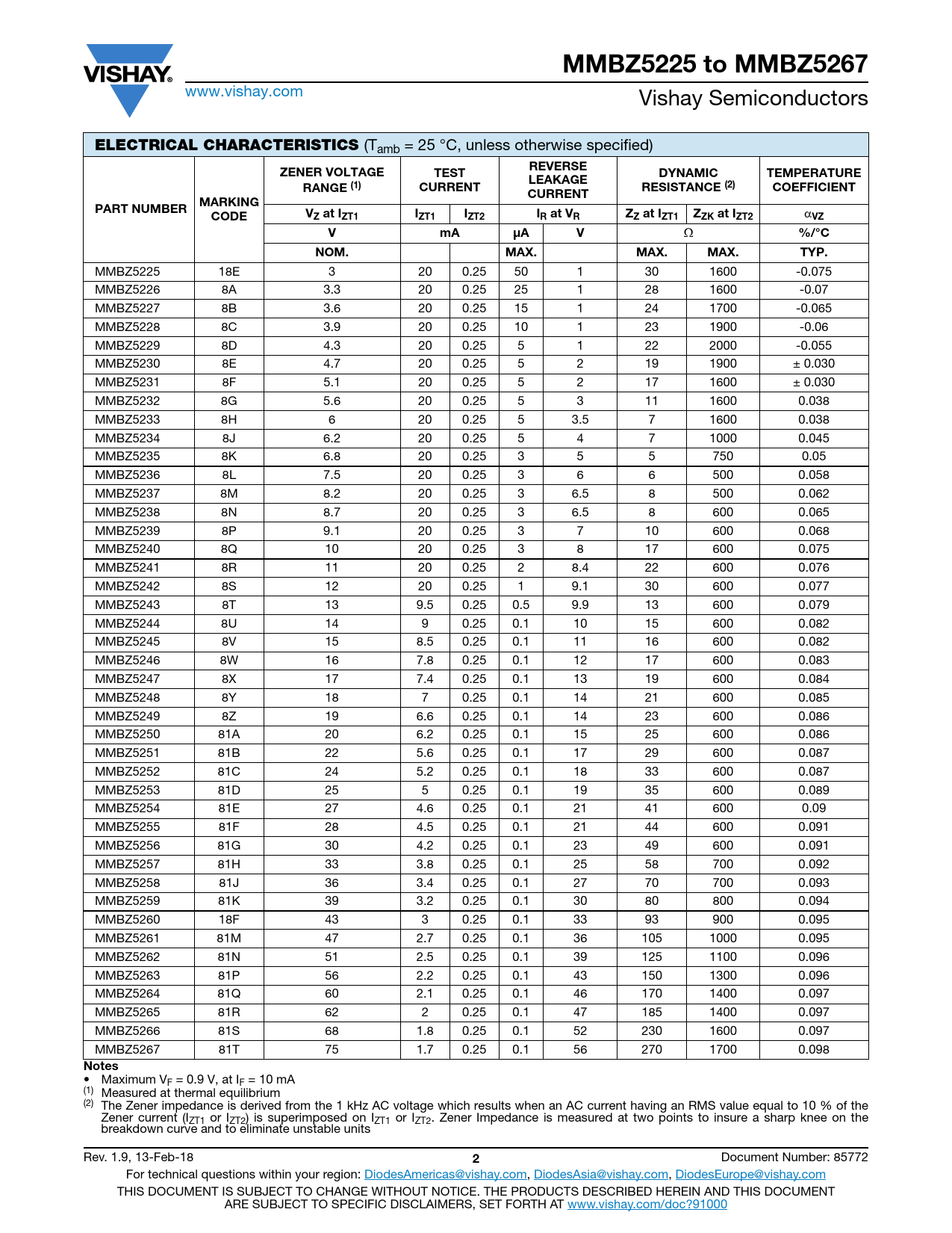 MMBZ5225 18E 3 20 0.25 50 1 30 1600 -0.075 MMBZ5226 8A 3.3 20 0.25 25 1 28 1600 -0.07 MMBZ5227 8B 3.6 20 0.25 15 1 24 1700 -0.065 MMBZ5228 8C 3.9 20 0.25 10 1 23 1900 -0.06 MMBZ5229 8D 4.3 20 0.25 5 1 22 2000 -0.055 MMBZ5230 8E 4.7 20 0.25 5 2 19 1900 ± 0.030 MMBZ5231 8F 5.1 20 0.25 5 2 17 1600 ± 0.030 MMBZ5232 8G 5.6 20 0.25 5 3 11 1600 0.038 MMBZ5233 8H 6 20 0.25 5 3.5 7 1600 0.038 MMBZ5234 8J 6.2 20 0.25 5 4 7 1000 0.045 MMBZ5235 8K 6.8 20 0.25 3 5 5 750 0.05 MMBZ5236 8L 7.5 20 0.25 3 6 6 500 0.058 MMBZ5237 8M 8.2 20 0.25 3 6.5 8 500 0.062 MMBZ5238 8N 8.7 20 0.25 3 6.5 8 600 0.065 MMBZ5239 8P 9.1 20 0.25 3 7 10 600 0.068 MMBZ5240 8Q 10 20 0.25 3 8 17 600 0.075 MMBZ5241 8R 11 20 0.25 2 8.4 22 600 0.076 MMBZ5242 8S 12 20 0.25 1 9.1 30 600 0.077 MMBZ5243 8T 13 9.5 0.25 0.5 9.9 13 600 0.079 MMBZ5244 8U 14 9 0.25 0.1 10 15 600 0.082 MMBZ5245 8V 15 8.5 0.25 0.1 11 16 600 0.082 MMBZ5246 8W 16 7.8 0.25 0.1 12 17 600 0.083 MMBZ5247 8X 17 7.4 0.25 0.1 13 19 600 0.084 MMBZ5248 8Y 18 7 0.25 0.1 14 21 600 0.085 MMBZ5249 8Z 19 6.6 0.25 0.1 14 23 600 0.086 MMBZ5250 81A 20 6.2 0.25 0.1 15 25 600 0.086 MMBZ5251 81B 22 5.6 0.25 0.1 17 29 600 0.087 MMBZ5252 81C 24 5.2 0.25 0.1 18 33 600 0.087 MMBZ5253 81D 25 5 0.25 0.1 19 35 600 0.089 MMBZ5254 81E 27 4.6 0.25 0.1 21 41 600 0.09 MMBZ5255 81F 28 4.5 0.25 0.1 21 44 600 0.091 MMBZ5256 81G 30 4.2 0.25 0.1 23 49 600 0.091 MMBZ5257 81H 33 3.8 0.25 0.1 25 58 700 0.092 MMBZ5258 81J 36 3.4 0.25 0.1 27 70 700 0.093 MMBZ5259 81K 39 3.2 0.25 0.1 30 80 800 0.094 MMBZ5260 18F 43 3 0.25 0.1 33 93 900 0.095 MMBZ5261 81M 47 2.7 0.25 0.1 36 105 1000 0.095 MMBZ5262 81N 51 2.5 0.25 0.1 39 125 1100 0.096 MMBZ5263 81P 56 2.2 0.25 0.1 43 150 1300 0.096 MMBZ5264 81Q 60 2.1 0.25 0.1 46 170 1400 0.097 MMBZ5265 81R 62 2 0.25 0.1 47 185 1400 0.097 MMBZ5266 81S 68 1.8 0.25 0.1 52 230 1600 0.097 MMBZ5267 81T 75 1.7 0.25 0.1 56 270 1700 0.098