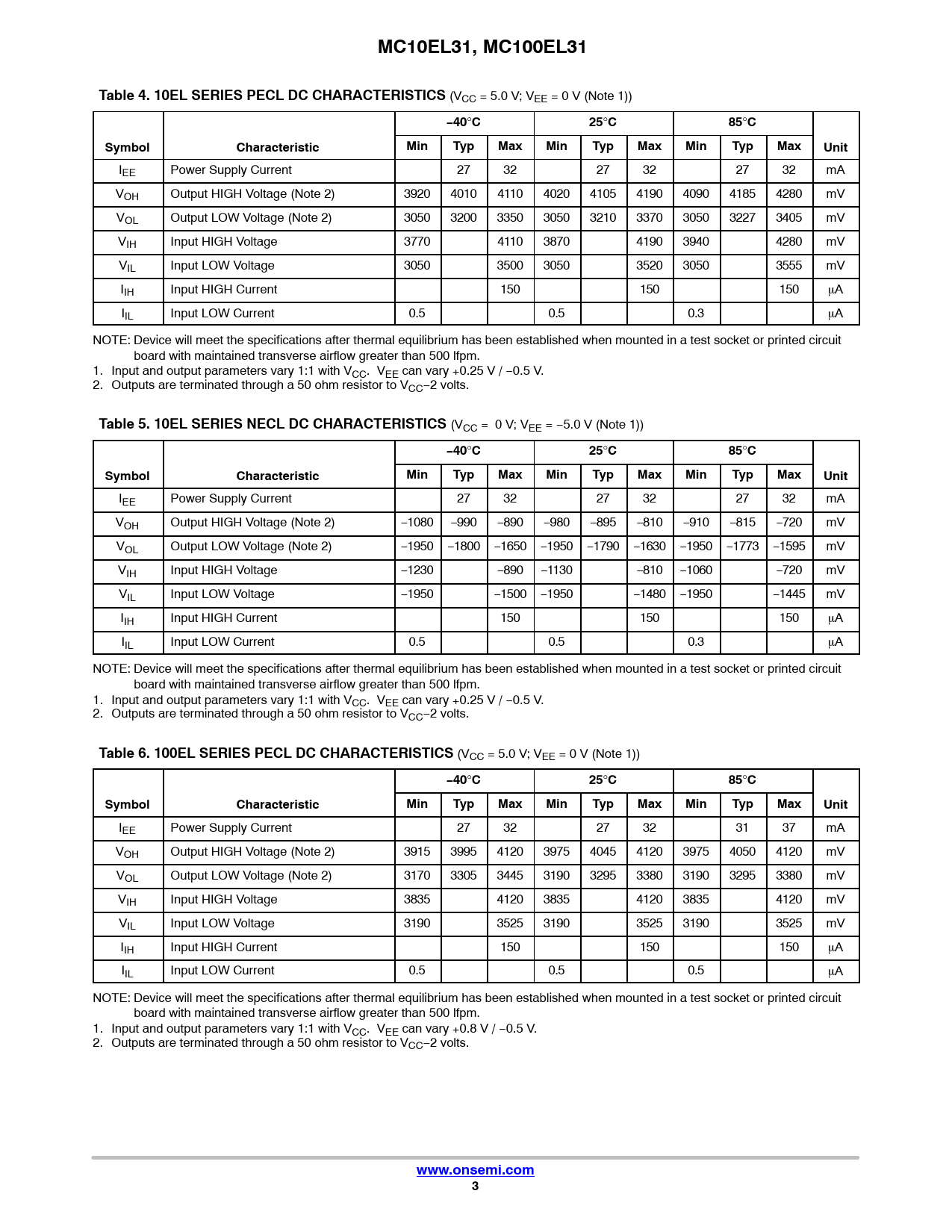 IEE Power Supply Current 27 32 27 32 27 32 mA VOH Output HIGH Voltage (Note 2) 3920 4010 4110 4020 4105 4190 4090 4185 4280 mV VOL Output LOW Voltage (Note 2) 3050 3200 3350 3050 3210 3370 3050 3227 3405 mV VIH Input HIGH Voltage 3770 4110 3870 4190 3940 4280 mV VIL Input LOW Voltage 3050 3500 3050 3520 3050 3555 mV IIH Input HIGH Current 150 150 150 mA IIL Input LOW Current 0.5 0.5 0.3 mA NOTE: Device will meet the specifications after thermal equilibrium has been established when mounted in a test socket or printed circuit board with maintained transverse airflow greater than 500 lfpm. 1. Input and output parameters vary 1:1 with VCC. VEE can vary +0.25 V / −0.5 V. 2. Outputs are terminated through a 50 ohm resistor to VCC−2 volts.