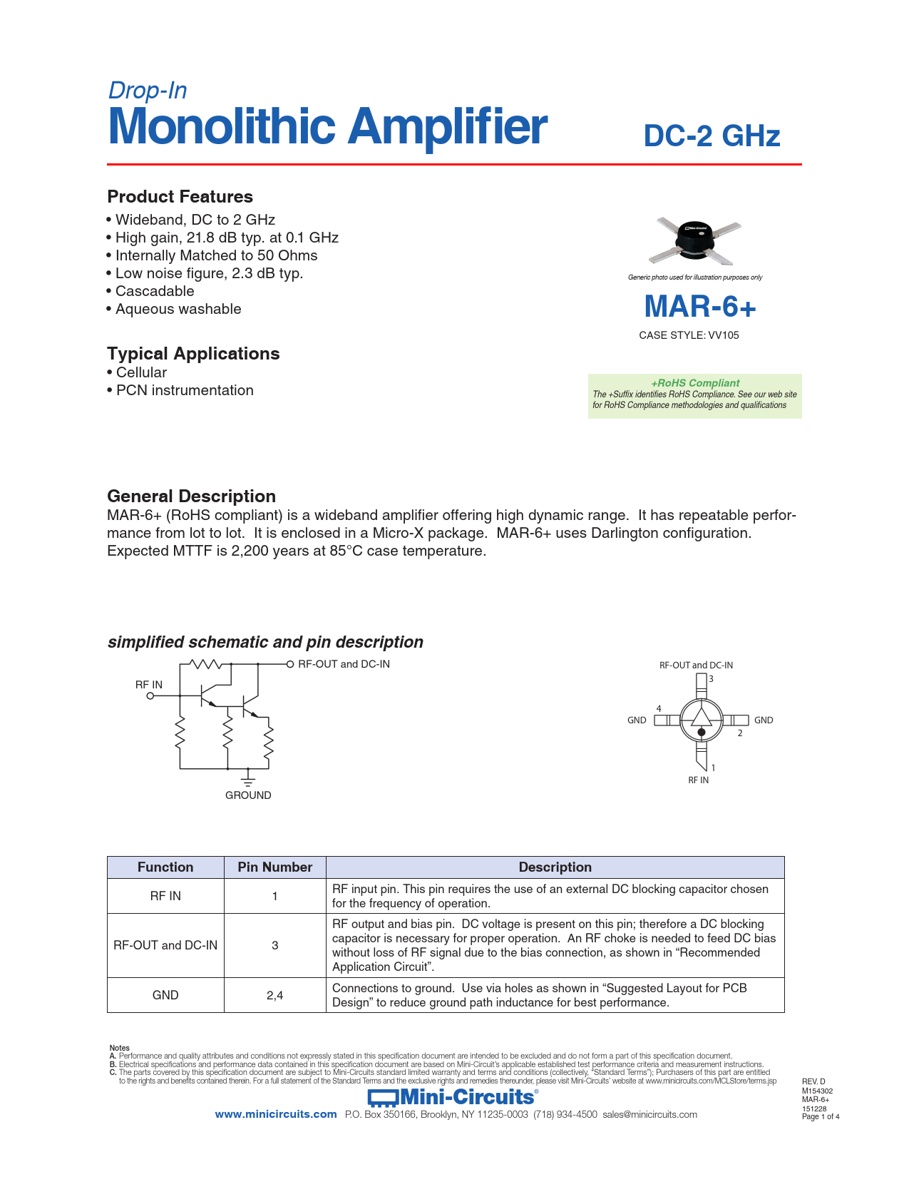 Drop-In Monolithic AmplifierDC-2 GHzProduct Features • Wideband, DC to 2 GHz • High gain, 21.8 dB typ. at 0.1 GHz • Internally Matched to 50 Ohms • Low noise figure, 2.3 dB typ. Generic photo used for illustration purposes only • Cascadable • Aqueous washable MAR-6+ CASE STYLE: VV105 Typical Applications • Cellular • PCN instrumentation +RoHS Compliant The +Suffix identifies RoHS Compliance. See our web site for RoHS Compliance methodologies and qualifications General Description MAR-6+ (RoHS compliant) is a wideband amplifier offering high dynamic range. It has repeatable perfor- mance from lot to lot. It is enclosed in a Micro-X package. MAR-6+ uses Darlington configuration. Expected MTTF is 2,200 years at 85°C case temperature. simplified schematic and pin description RF-OUT and DC-IN RF-OUT and DC-IN 3 RF IN 4 GND GND 2 1 RF IN GROUND FunctionPin NumberDescription RF input pin. This pin requires the use of an external DC blocking capacitor chosen RF IN 1 for the frequency of operation. RF output and bias pin. DC voltage is present on this pin; therefore a DC blocking capacitor is necessary for proper operation. An RF choke is needed to feed DC bias RF-OUT and DC-IN 3 without loss of RF signal due to the bias connection, as shown in “Recommended Application Circuit”. Connections to ground. Use via holes as shown in “Suggested Layout for PCB GND 2,4 Design” to reduce ground path inductance for best performance. Notes A. Performance and quality attributes and conditions not expressly stated in this specification document are intended to be excluded and do not form a part of this specification document. B. Electrical specifications and performance data contained in this specification document are based on Mini-Circuit’s applicable established test performance criteria and measurement instructions. C. The parts covered by this specification document are subject to Mini-Circuits standard limited warranty and terms and conditions (collectively, “Standard Terms”); Purchasers of this part are entitled to the rights and benefits contained therein. For a full statement of the Standard Terms and the exclusive rights and remedies thereunder, please visit Mini-Circuits’ website at www.minicircuits.com/MCLStore/terms.jsp REV. D Mini-Circuits ® M154302 MAR-6+ www.minicircuits.com 151228 P.O. Box 350166, Brooklyn, NY 11235-0003 (718) 934-4500 sales@minicircuits.com Page 1 of 4 Document Outline MAR-6+ Data Sheet View Data View Graphs Case Style Tape and Reel PCB Layout Eval Board Enviromental Ratings