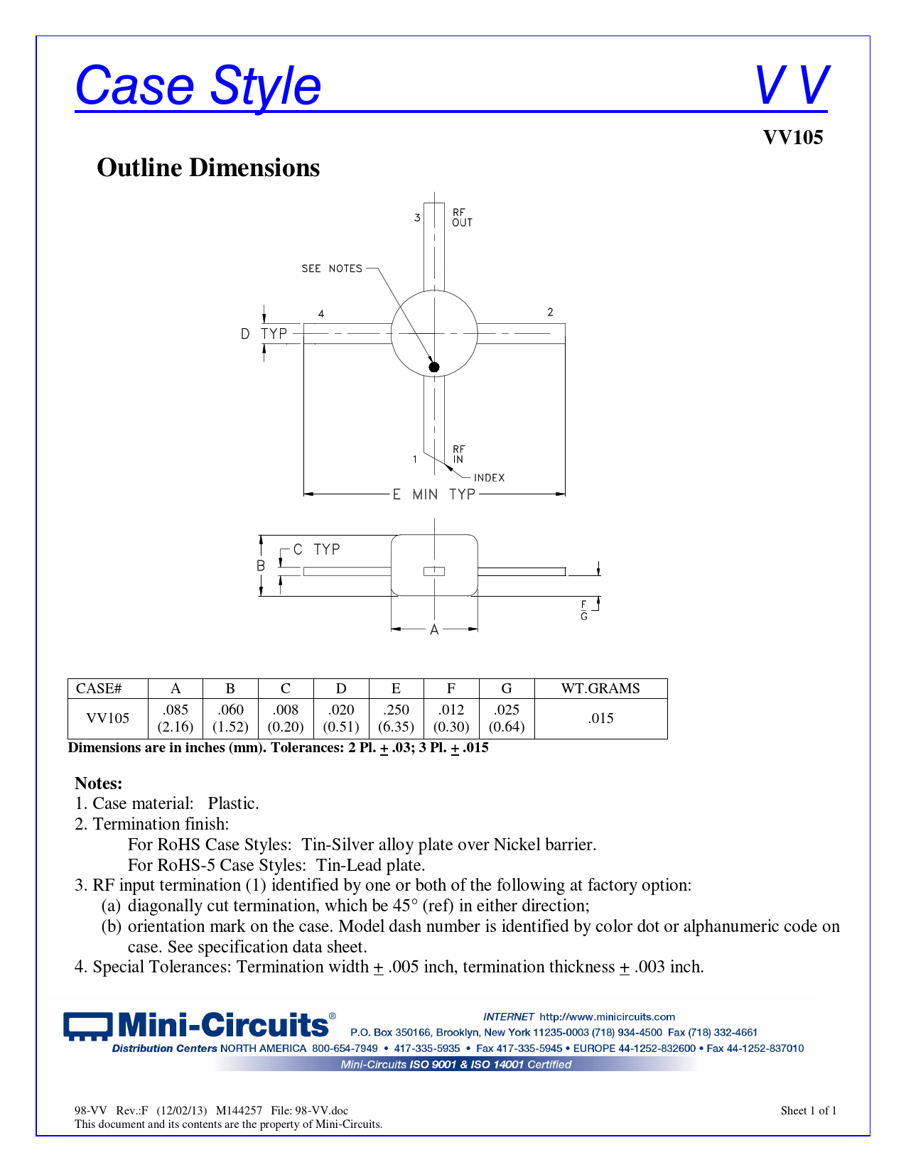 Case Style V V VV105Outline Dimensions CASE# A B C D E F G WT.GRAMS .085 .060 .008 .020 .250 .012 .025 VV105 .015 (2.16) (1.52) (0.20) (0.51) (6.35) (0.30) (0.64) Dimensions are in inches (mm). Tolerances: 2 Pl. + .03; 3 Pl. + .015Notes: 1. Case material: Plastic. 2. Termination finish: For RoHS Case Styles: Tin-Silver alloy plate over Nickel barrier. For RoHS-5 Case Styles: Tin-Lead plate. 3. RF input termination (1) identified by one or both of the following at factory option: (a) diagonally cut termination, which be 45° (ref) in either direction; (b) orientation mark on the case. Model dash number is identified by color dot or alphanumeric code on case. See specification data sheet. 4. Special Tolerances: Termination width + .005 inch, termination thickness + .003 inch. 98-VV Rev.:F (12/02/13) M144257 File: 98-VV.doc Sheet 1 of 1 This document and its contents are the property of Mini-Circuits. Document Outline MAR-6+ Data Sheet View Data View Graphs Case Style Tape and Reel PCB Layout Eval Board Enviromental Ratings