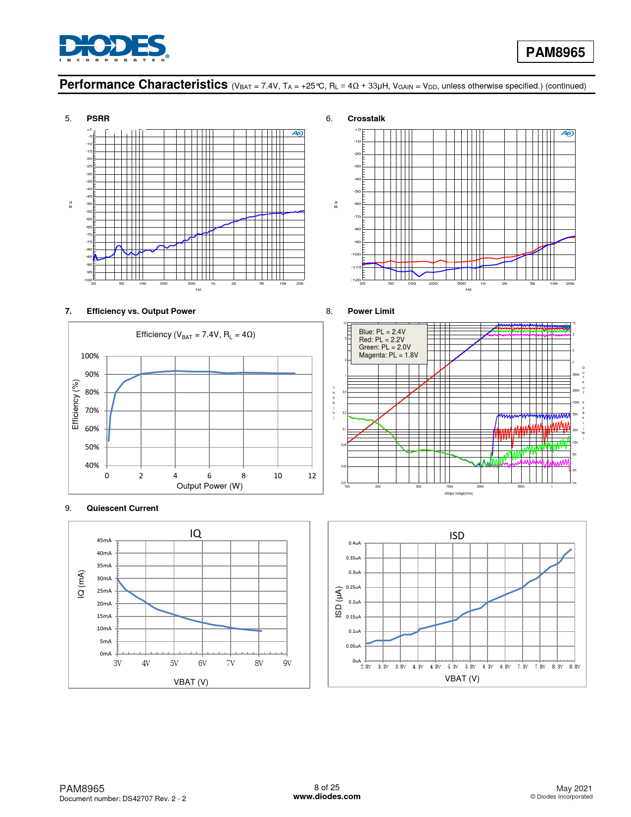 PAM8965. Performance Characteristics. PSRR. Crosstalk. Efficiency vs. Output Power. Power Limit. Quiescent Current. www.diodes.com