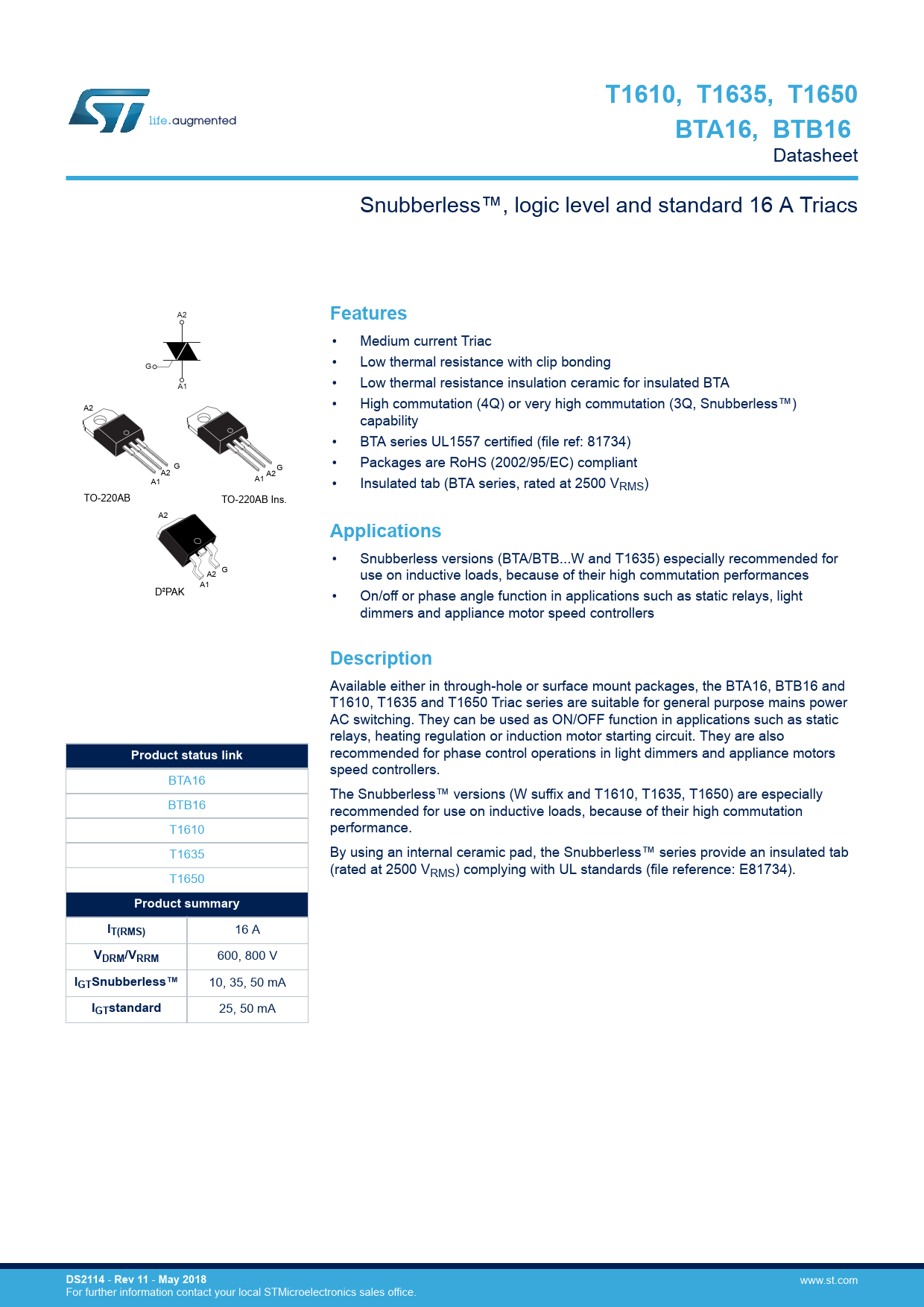 T1610, T1635, T1650BTA16, BTB16 Datasheet Snubberless™, logic level and standard 16 A Triacs A2 Features • Medium current Triac • Low thermal resistance with clip bonding G A1 • Low thermal resistance insulation ceramic for insulated BTA A2 • High commutation (4Q) or very high commutation (3Q, Snubberless™) capability • BTA series UL1557 certified (file ref: 81734) G • Packages are RoHS (2002/95/EC) compliant G A2 A2 A1 A1 • Insulated tab (BTA series, rated at 2500 VRMS) TO-220AB TO-220AB Ins. A2 Applications • Snubberless versions (BTA/BTB...W and T1635) especially recommended for G A2 use on inductive loads, because of their high commutation performances A1 D²PAK • On/off or phase angle function in applications such as static relays, light dimmers and appliance motor speed controllers Description Available either in through-hole or surface mount packages, the BTA16, BTB16 and T1610, T1635 and T1650 Triac series are suitable for general purpose mains power AC switching. They can be used as ON/OFF function in applications such as static relays, heating regulation or induction motor starting circuit. They are also Product status link recommended for phase control operations in light dimmers and appliance motors speed controllers. BTA16 The Snubberless™ versions (W suffix and T1610, T1635, T1650) are especially BTB16 recommended for use on inductive loads, because of their high commutation T1610 performance. T1635 By using an internal ceramic pad, the Snubberless™ series provide an insulated tab (rated at 2500 VRMS) complying with UL standards (file reference: E81734). T1650 Product summaryIT(RMS) 16 A VDRM/VRRM 600, 800 V IGTSnubberless™ 10, 35, 50 mA IGTstandard 25, 50 mA DS2114 - Rev 11 - May 2018 www.st.com For further information contact your local STMicroelectronics sales office. Document Outline 1 Characteristics 1.1 Characteristics (curves) 2 Package information 2.1 TO-220AB Insulated and non Insulated package information 2.1.1 TO-220AB Insulated and non Insulated package information 2.2 D²PAK package information 2.2.1 D²PAK package information 3 Ordering information 3.1 Product selector 3.2 Ordering information Revision history