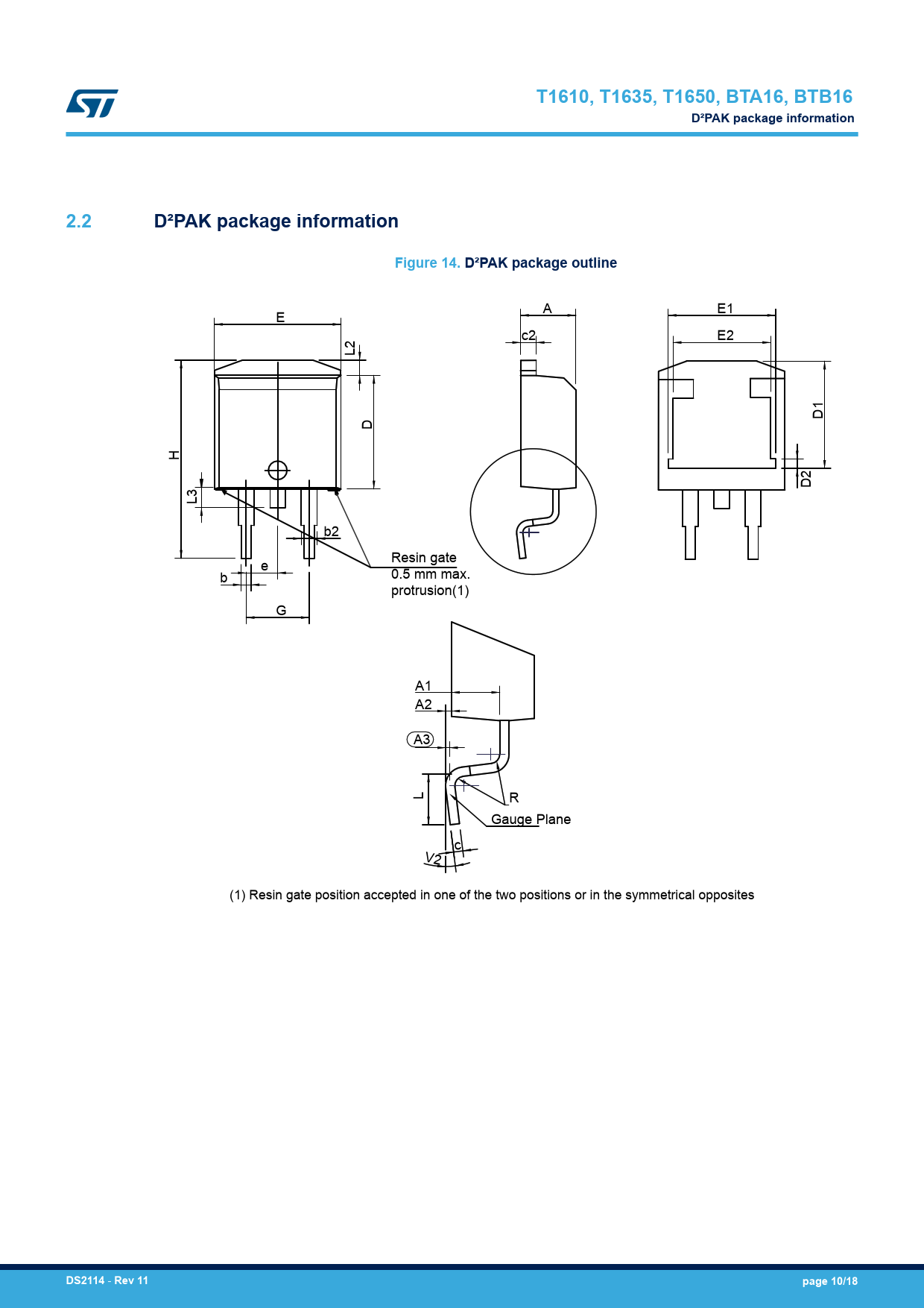 T1610, T1635, T1650, BTA16, BTB16. D²PAK package information. 2.2. Figure 14. D²PAK package outline. DS2114. Rev 11. page 10/18