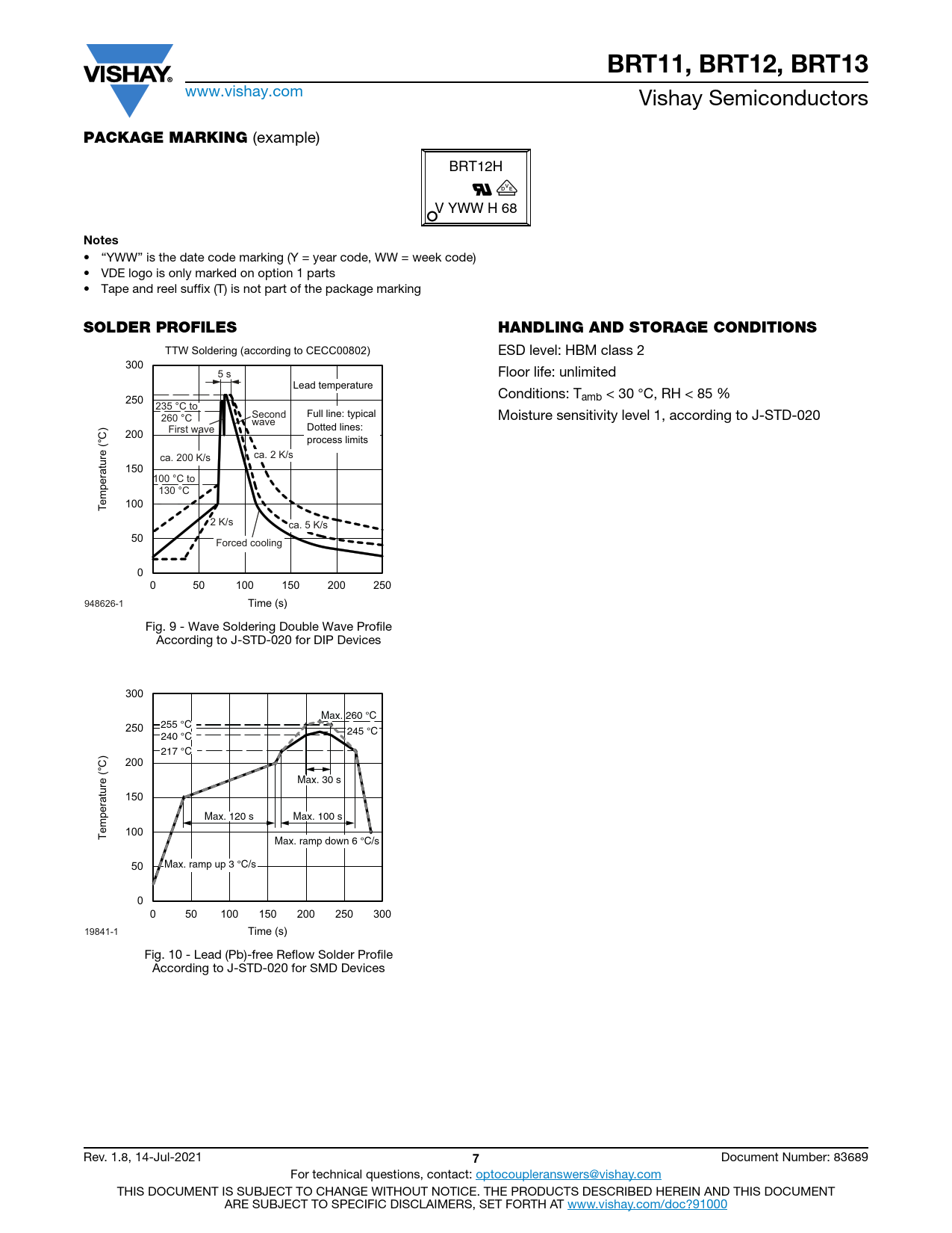 BRT11, BRT12, BRT13 www.vishay.com Vishay Semiconductors PACKAGE MARKING (example) BRT12H V YWW H 68 Notes • “YWW” is the date code marking (Y = year code, WW = week code) • VDE logo is only marked on option 1 parts • Tape and reel suffix (T) is not part of the package marking SOLDER PROFILESHANDLING AND STORAGE CONDITIONS TTW Soldering (according to CECC00802) ESD level: HBM class 2 300 10000 5 s Floor life: unlimited Lead temperature Conditions: Tamb < 30 °C, RH < 85 % 250 235 °C to Second Full line: typical 260 °C Moisture sensitivity level 1, according to J-STD-020 wave First wave Dotted lines: 200 1000 process limits ca. 200 K/s ca. 2 K/s ne ine ne 150 100 °C to 1st li 2nd l 2nd li 130 °C 100 100 Temperature (°C) 2 K/s ca. 5 K/s 50 Forced cooling 0 10 0 50 100 150 200 250 948626-1 Time (s) Fig. 9 - Wave Soldering Double Wave Profile According to J-STD-020 for DIP Devices Axis Title 300 10000 Max. 260 °C 255 °C 250 245 °C 240 °C 217 °C 200 1000 Max. 30 s ine ne ne 150 1st li 2nd l 2nd li Max. 120 s Max. 100 s 100 100 Temperature (°C) Max. ramp down 6 °C/s 50 Max. ramp up 3 °C/s 0 10 0 50 100 150 200 250 300 19841-1 Time (s) Fig. 10 - Lead (Pb)-free Reflow Solder Profile According to J-STD-020 for SMD Devices Rev. 1.8, 14-Jul-2021 7 Document Number: 83689 For technical questions, contact: optocoupleranswers@vishay.com THIS DOCUMENT IS SUBJECT TO CHANGE WITHOUT NOTICE. THE PRODUCTS DESCRIBED HEREIN AND THIS DOCUMENT ARE SUBJECT TO SPECIFIC DISCLAIMERS, SET FORTH AT www.vishay.com/doc?91000