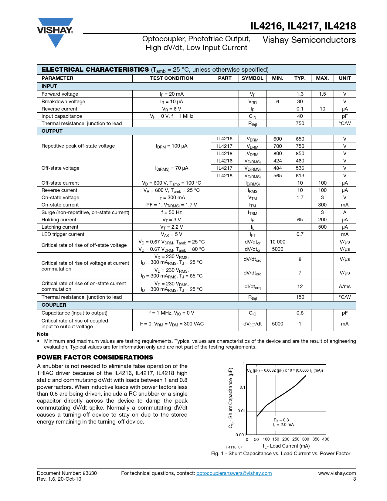 A snubber is not needed to eliminate false operation of the 1 TRIAC driver because of the IL4216, IL4217, IL4218 high C (µF) = 0.0032 (µF) x 10 ^ (0.0066 I (mA)) S L static and commutating dV/dt with loads between 1 and 0.8 power factors. When inductive loads with power factors less 0.1 than 0.8 are being driven, include a RC snubber or a single capacitor directly across the device to damp the peak commutating dV/dt spike. Normally a commutating dV/dt 0.01 causes a turning-off device to stay on due to the stored energy remaining in the turning-off device. - Shunt Capacitance (µF) P = 0.3 F SC I = 2.0 mA F 0.001 0 50 100 150 200 250 300 350 400 iil4116_07 I - Load Current (mA) L Fig. 1 - Shunt Capacitance vs. Load Current vs. Power Factor Document Number: 83630 For technical questions, contact: optocoupleranswers@vishay.com www.vishay.com Rev. 1.6, 20-Oct-10 3