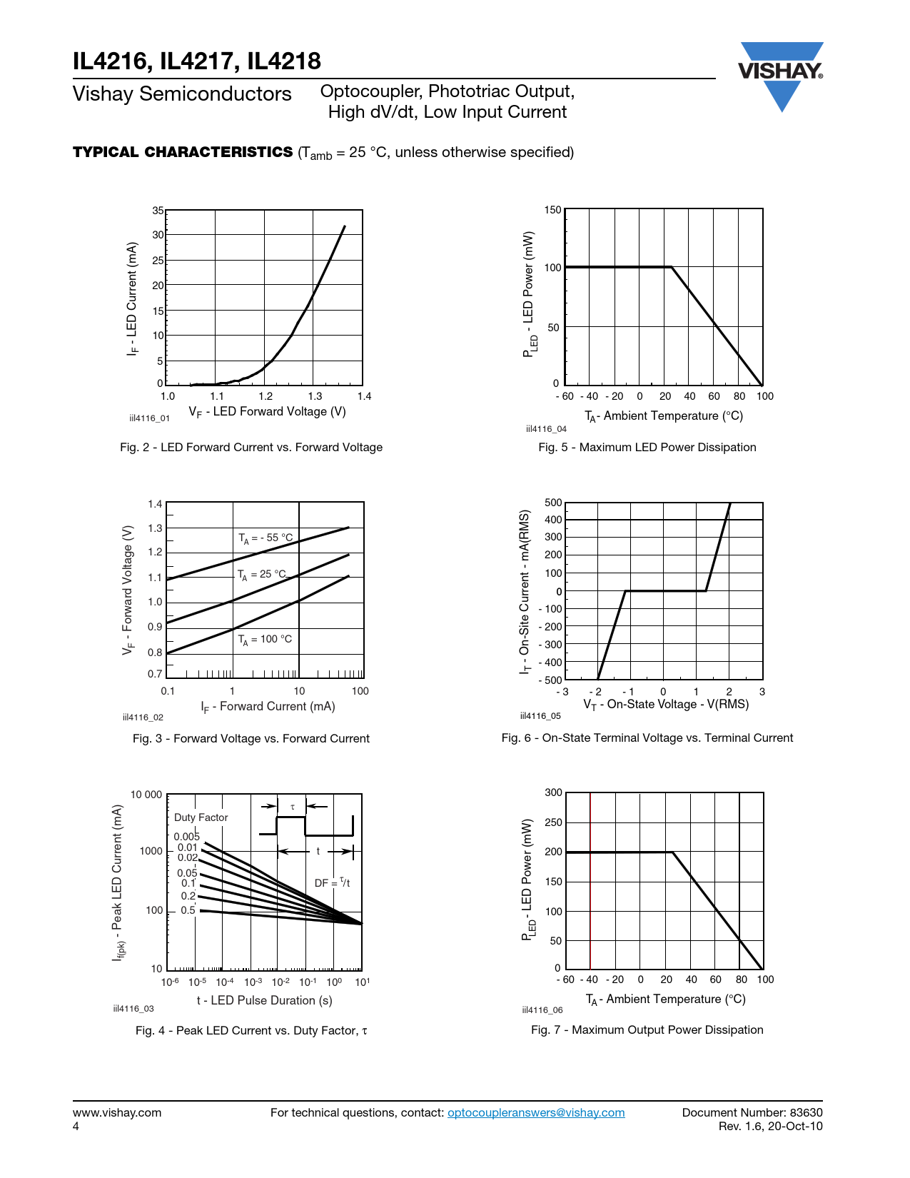 IL4216, IL4217, IL4218 Vishay Semiconductors Optocoupler, Phototriac Output, High dV/dt, Low Input Current TYPICAL CHARACTERISTICS (Tamb = 25 °C, unless otherwise specified) 35 150 30 25 100 20 15 - LED Power (mW) 50 10 - LED Current (mA) I F P LED 5 0 0 1.0 1.1 1.2 1.3 1.4 - 60 - 40 - 20 0 20 40 60 80 100 V iil4116_01 F - LED Forward Voltage (V) T - Ambient Temperature (°C) A iil4116_04 Fig. 2 - LED Forward Current vs. Forward Voltage Fig. 5 - Maximum LED Power Dissipation 1.4 500 400 1.3 T = - 55 °C 300 A 1.2 200 1.1 T = 25 °C 100 A 0 1.0 - 100 0.9 - 200 - Forward Voltage (V) T = 100 °C F A - 300 V 0.8 - On-Site Current - mA(RMS) - 400 0.7 I T - 500 0.1 1 10 100 - 3 - 2 - 1 0 1 2 3 I V F - Forward Current (mA) T - On-State Voltage - V(RMS) iil4116_02 iil4116_05 Fig. 3 - Forward Voltage vs. Forward Current Fig. 6 - On-State Terminal Voltage vs. Terminal Current 10 000 300 τ Duty Factor 250 0.005 1000 0.01 t 200 0.02 0.05 τ 0.1 DF = /t 150 0.2 100 0.5 - LED Power (mW) 100 - Peak LED Current (mA) P LED 50 I f(pk) 10 0 10-6 10-5 10-4 10-3 10-2 10-1 100 101 - 60 - 40 - 20 0 20 40 60 80 100 t - LED Pulse Duration (s) T - Ambient Temperature (°C) A iil4116_03 iil4116_06 Fig. 4 - Peak LED Current vs. Duty Factor, τ Fig. 7 - Maximum Output Power Dissipation www.vishay.com For technical questions, contact: optocoupleranswers@vishay.com Document Number: 83630 4 Rev. 1.6, 20-Oct-10