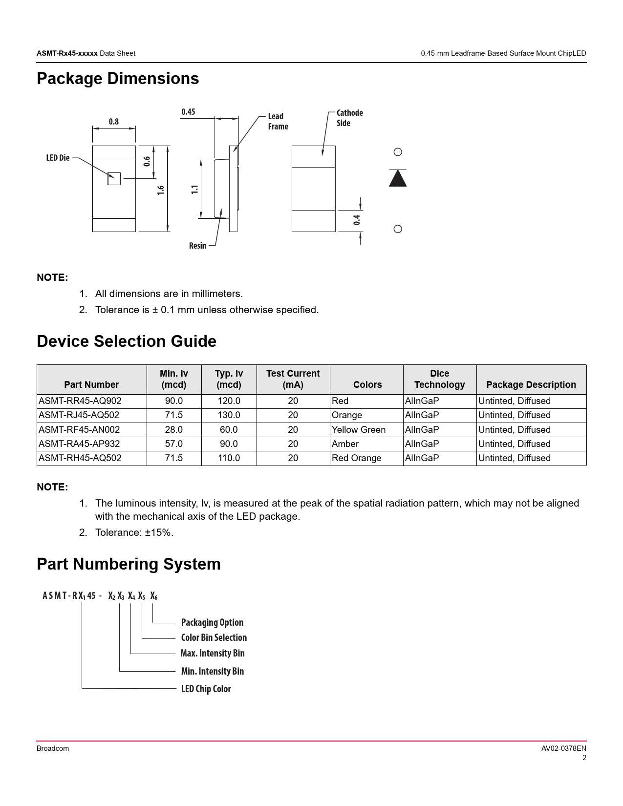 ASMT-Rx45-xxxxx. Package Dimensions. 0.45. Lead. Cathode. 0.8. Frame. Side. LED Die. 0.6. 1.6. 1.1. 0.4. Resin. NOTE:. Device Selection Guide. Min. Iv