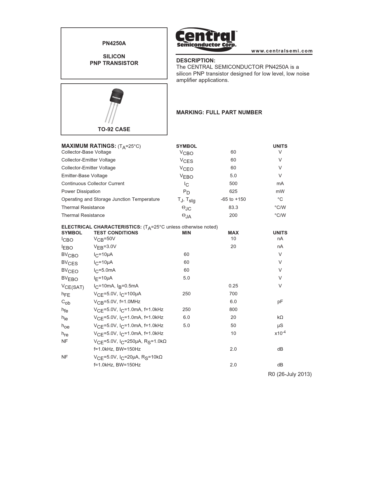 PN4250Aw w w. c e n t r a l s e m i . c o mSILICONDESCRIPTION:PNP TRANSISTOR The CENTRAL SEMICONDUCTOR PN4250A is a silicon PNP transistor designed for low level, low noise amplifier applications. MARKING: FULL PART NUMBERTO-92 CASEMAXIMUM RATINGS: (TA=25°C) SYMBOL UNITS Collector-Base Voltage VCBO 60 V Collector-Emitter Voltage VCES 60 V Collector-Emitter Voltage VCEO 60 V Emitter-Base Voltage VEBO 5.0 V Continuous Collector Current IC 500 mA Power Dissipation PD 625 mW Operating and Storage Junction Temperature TJ, Tstg -65 to +150 °C Thermal Resistance ΘJC 83.3 °C/W Thermal Resistance ΘJA 200 °C/W ELECTRICAL CHARACTERISTICS: (TA=25°C unless otherwise noted) SYMBOL TESTCONDITIONSMINMAXUNITS ICBO VCB=50V 10 nA IEBO VEB=3.0V 20 nA BVCBO IC=10μA 60 V BVCES IC=10μA 60 V BVCEO IC=5.0mA 60 V BVEBO IE=10μA 5.0 V VCE(SAT) IC=10mA, IB=0.5mA 0.25 V hFE VCE=5.0V, IC=100μA 250 700 Cob VCB=5.0V, f=1.0MHz 6.0 pF hfe VCE=5.0V, IC=1.0mA, f=1.0kHz 250 800 hie VCE=5.0V, IC=1.0mA, f=1.0kHz 6.0 20 kΩ hoe VCE=5.0V, IC=1.0mA, f=1.0kHz 5.0 50 μS hre VCE=5.0V, IC=1.0mA, f=1.0kHz 10 x10-4 NF VCE=5.0V, IC=250μA, RS=1.0kΩ f=1.0kHz, BW=150Hz 2.0 dB NF VCE=5.0V, IC=20μA, RS=10kΩ f=1.0kHz, BW=150Hz 2.0 dB R0 (26-July 2013)