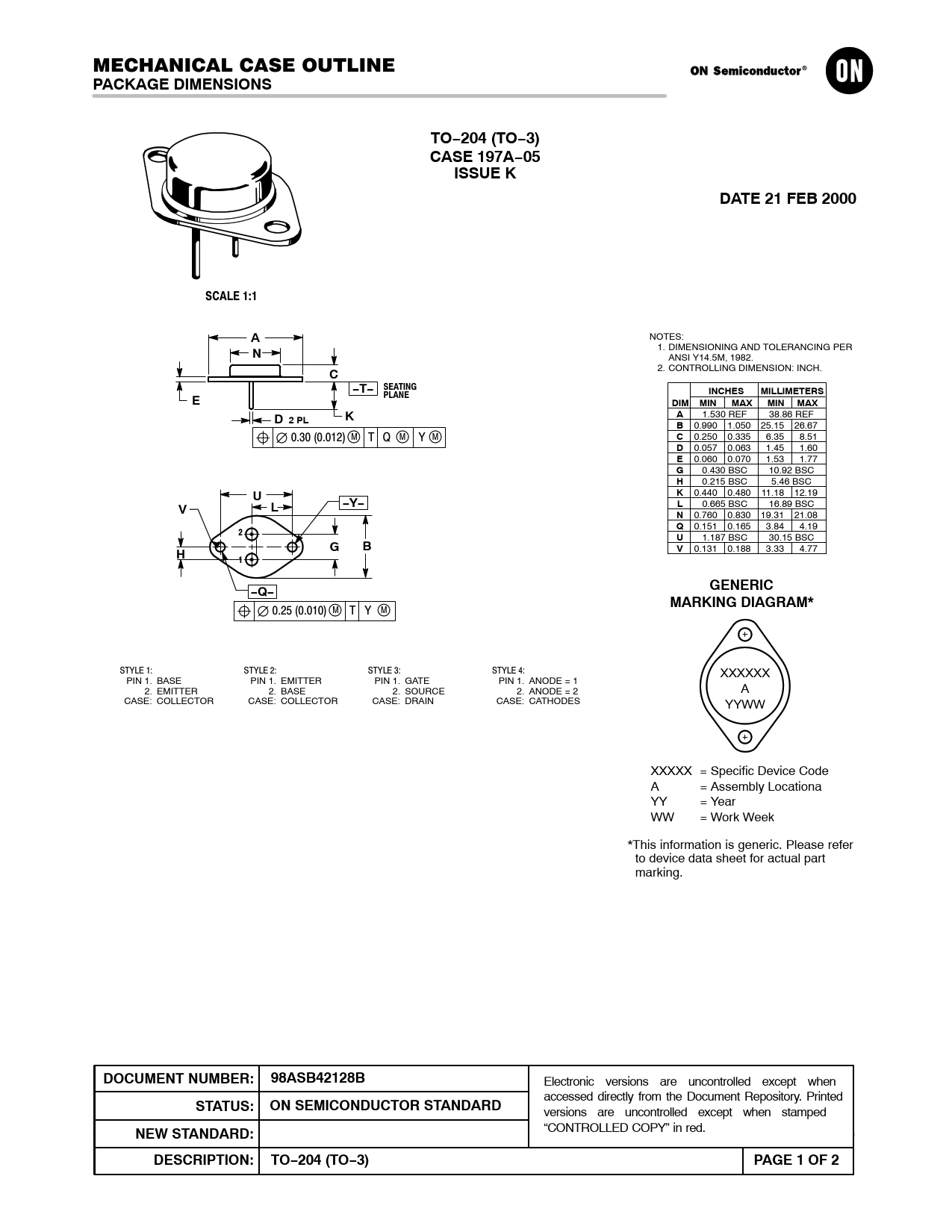 PACKAGE DIMENSIONS TO−204 (TO−3) CASE 197A−05 ISSUE K DATE 21 FEB 2000 SCALE 1:1 A