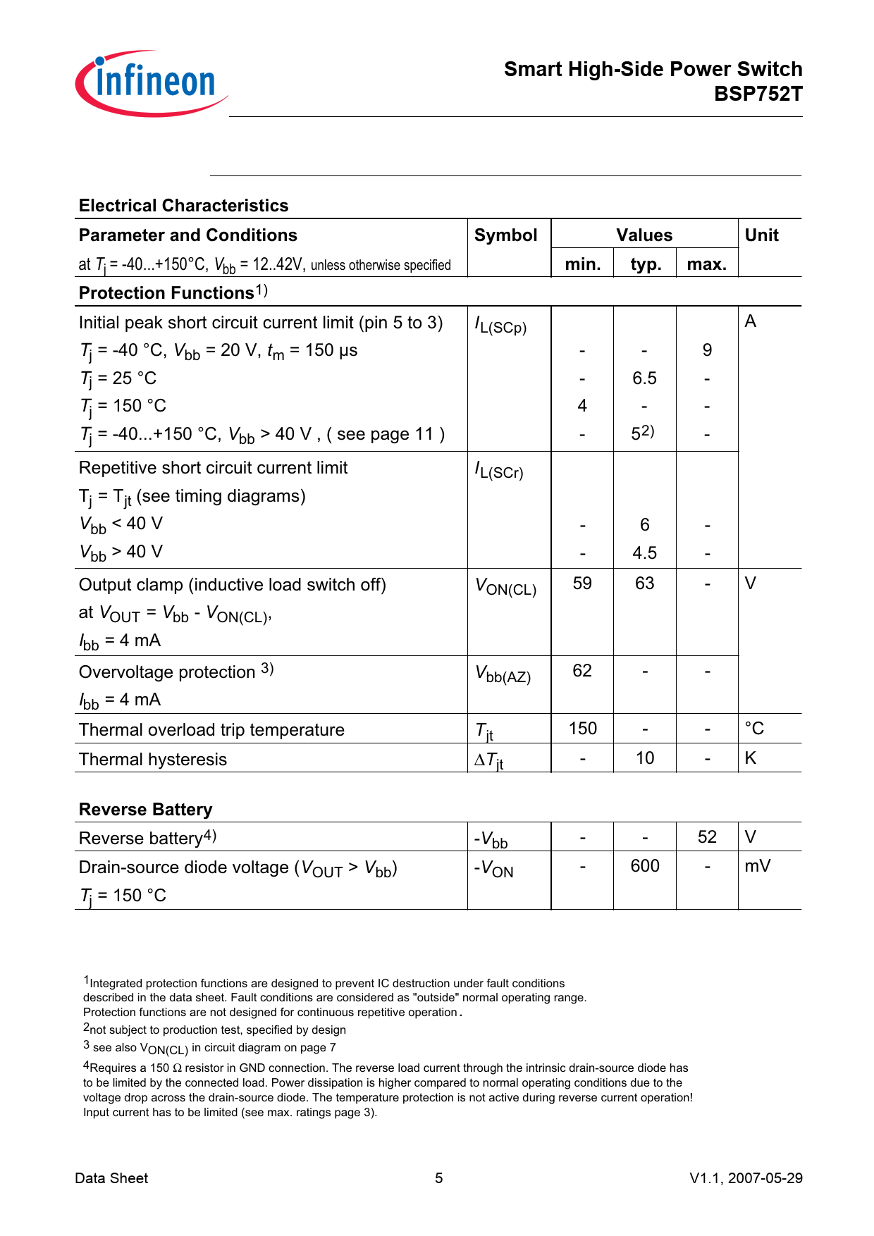 Smart High-Side Power Switch BSP752T (OHFWULFDO&KDUDFWHULVWLFV 3DUDPHWHUDQG&RQGLWLRQV 6\PERO 9DOXHV 8QLW
