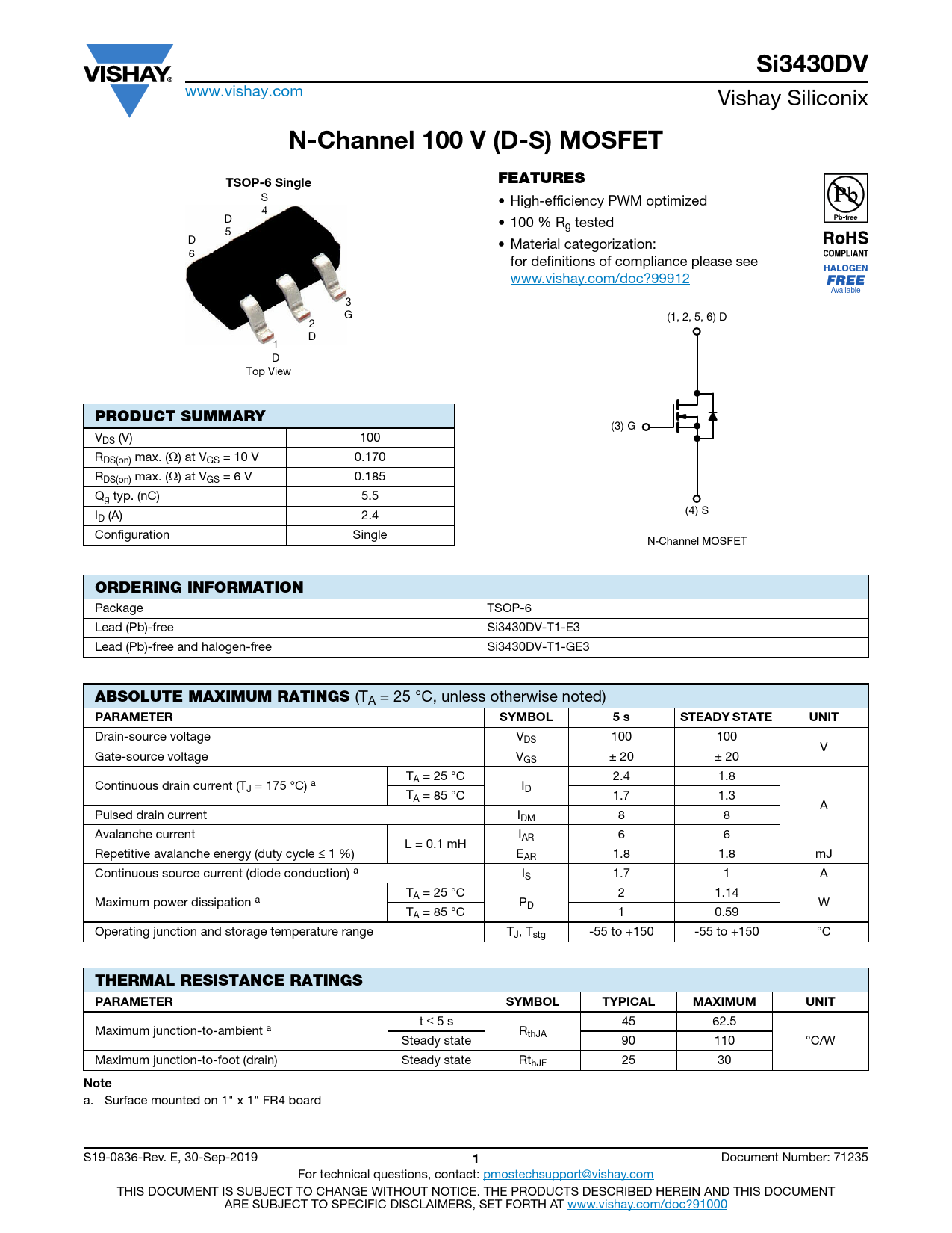 Si3430DV. N-Channel 100 V (D-S) MOSFET. TSOP-6 Single. FEATURES. PRODUCT SUMMARY. ORDERING INFORMATION. ABSOLUTE MAXIMUM RATINGS