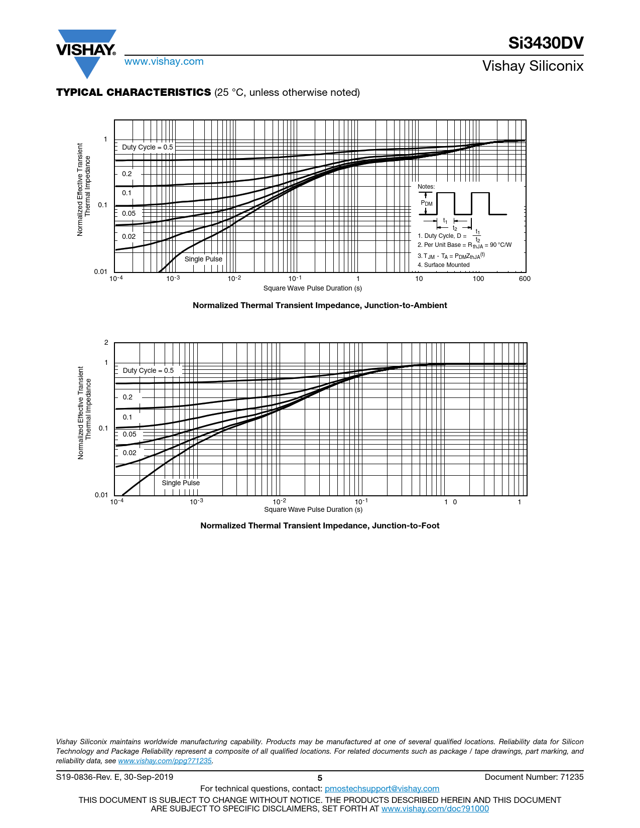 Si3430DV www.vishay.com Vishay Siliconix TYPICAL CHARACTERISTICS (25 °C, unless otherwise noted) 1 Duty Cycle = 0.5 ransient 0.2 e T v Notes: fecti 0.1 mal Impedance 0.1 P ed Ef DM Ther 0.05 maliz t1 t2 Nor t1 0.02 1. Duty Cycle, D = t2 2. Per Unit Base = R thJA = 90 °C/W 3. T (t) Single Pulse JM - TA = PDMZthJA 4. Surface Mounted 0.01 10-3 10-2 10-1 10-4 1 10 100 600 Square Wave Pulse Duration (s) Normalized Thermal Transient Impedance, Junction-to-Ambient 2 1 Duty Cycle = 0.5 ransient 0.2 e T v fecti 0.1 mal Impedance 0.1 ed Ef 0.05 Ther maliz 0.02 Nor Single Pulse 0.01 10-3 10-2 10-1 10-4 1 0 1 Square Wave Pulse Duration (s) Normalized Thermal Transient Impedance, Junction-to-Foot Vishay Siliconix maintains worldwide manufacturing capability. Products may be manufactured at one of several qualified locations. Reliability data for Silicon Technology and Package Reliability represent a composite of all qualified locations. For related documents such as package / tape drawings, part marking, and reliability data, see www.vishay.com/ppg?71235. S19-0836-Rev. E, 30-Sep-2019 5 Document Number: 71235 For technical questions, contact: pmostechsupport@vishay.com THIS DOCUMENT IS SUBJECT TO CHANGE WITHOUT NOTICE. THE PRODUCTS DESCRIBED HEREIN AND THIS DOCUMENT ARE SUBJECT TO SPECIFIC DISCLAIMERS, SET FORTH AT www.vishay.com/doc?91000