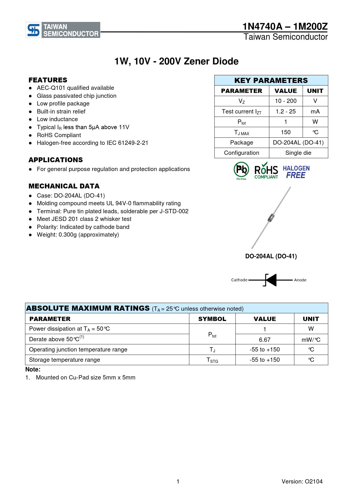 1W, 10V - 200V Zener Diode FEATURES KEY PARAMETERS