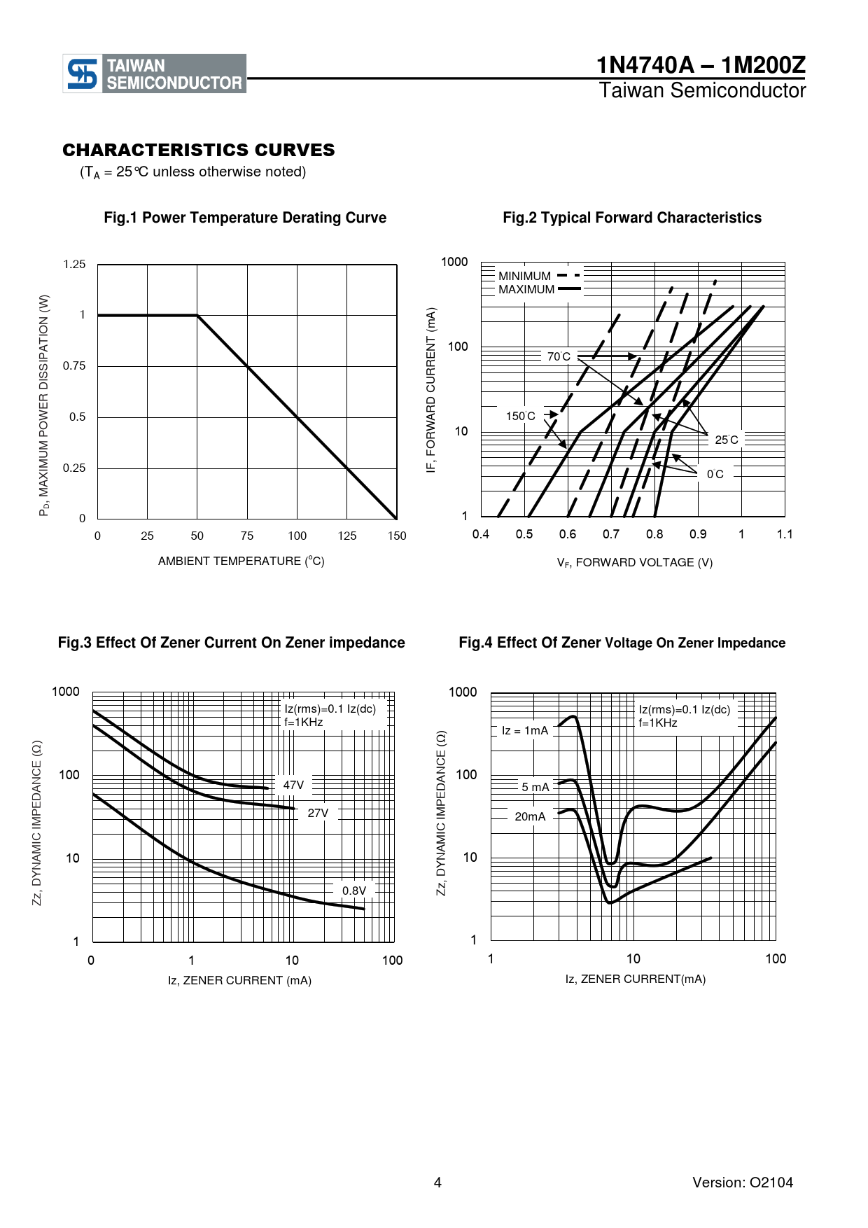 1N4740A – 1M200Z Taiwan Semiconductor CHARACTERISTICS CURVES (TA = 25°C unless otherwise noted) Fig.1 Power Temperature Derating CurveFig.2 Typical Forward Characteristics 1.25 1000 MINIMUM MAXIMUM W)( 1 ) mA ON ( TI T A N 100 P E I S 0.75 70°C R R SI U D C R D E 0.5 R A 150°C OW W P 10 25°C FOR MUMI 0.25 F,I X 0°C MA ,DP 0 1 0 25 50 75 100 125 150 0.4 0.5 0.6 0.7 0.8 0.9 1 1.1 AMBIENT TEMPERATURE (oC) VF, FORW ARD VOLTAGE (V) Fig.3 Effect Of Zener Current On Zener impedanceFig.4 Effect Of Zener Voltage On Zener Impedance 1000 1000 Iz(rms)=0.1 Iz(dc) Iz(rms)=0.1 Iz(dc) f=1KHz f=1KHz Iz = 1mA Ω)( Ω)( E E C C 100 N 100 N A 47V A D D E 5 mA E P 27V MI 20mA MPI CI CI M M A A 10 N 10 N Y Y D , D , 0.8V Zz Zz 1 1 0 1 10 100 1 10 100 Iz, ZENER CURRENT (mA) Iz, ZENER CURRENT(mA) 4 Version: O2104