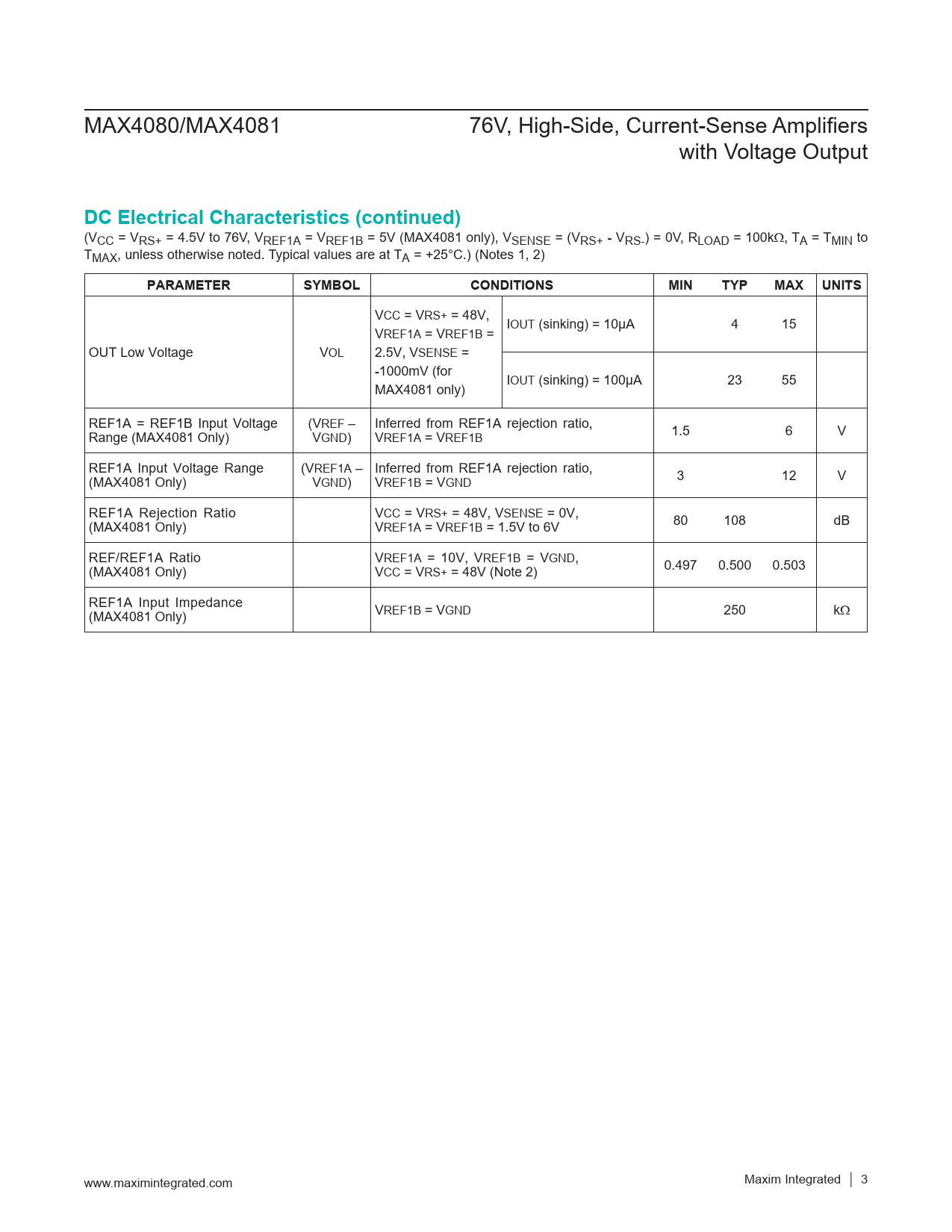 VCC = VRS+ = 48V, I V OUT (sinking) = 10µA 4 15 REF1A = VREF1B = OUT Low Voltage VOL 2.5V, VSENSE = -1000mV (for I MAX4081 only) OUT (sinking) = 100µA 23 55 REF1A = REF1B Input Voltage (VREF – Inferred from REF1A rejection ratio, Range (MAX4081 Only) VGND) VREF1A = VREF1B 1.5 6 V REF1A Input Voltage Range (VREF1A – Inferred from REF1A rejection ratio, (MAX4081 Only) VGND) VREF1B = VGND 3 12 V REF1A Rejection Ratio VCC = VRS+ = 48V, VSENSE = 0V, (MAX4081 Only) VREF1A = VREF1B = 1.5V to 6V 80 108 dB REF/REF1A Ratio VREF1A = 10V, VREF1B = VGND, (MAX4081 Only) VCC = VRS+ = 48V (Note 2) 0.497 0.500 0.503 REF1A Input Impedance (MAX4081 Only) VREF1B = VGND 250 kΩ www.maximintegrated.com Maxim Integrated │ 3