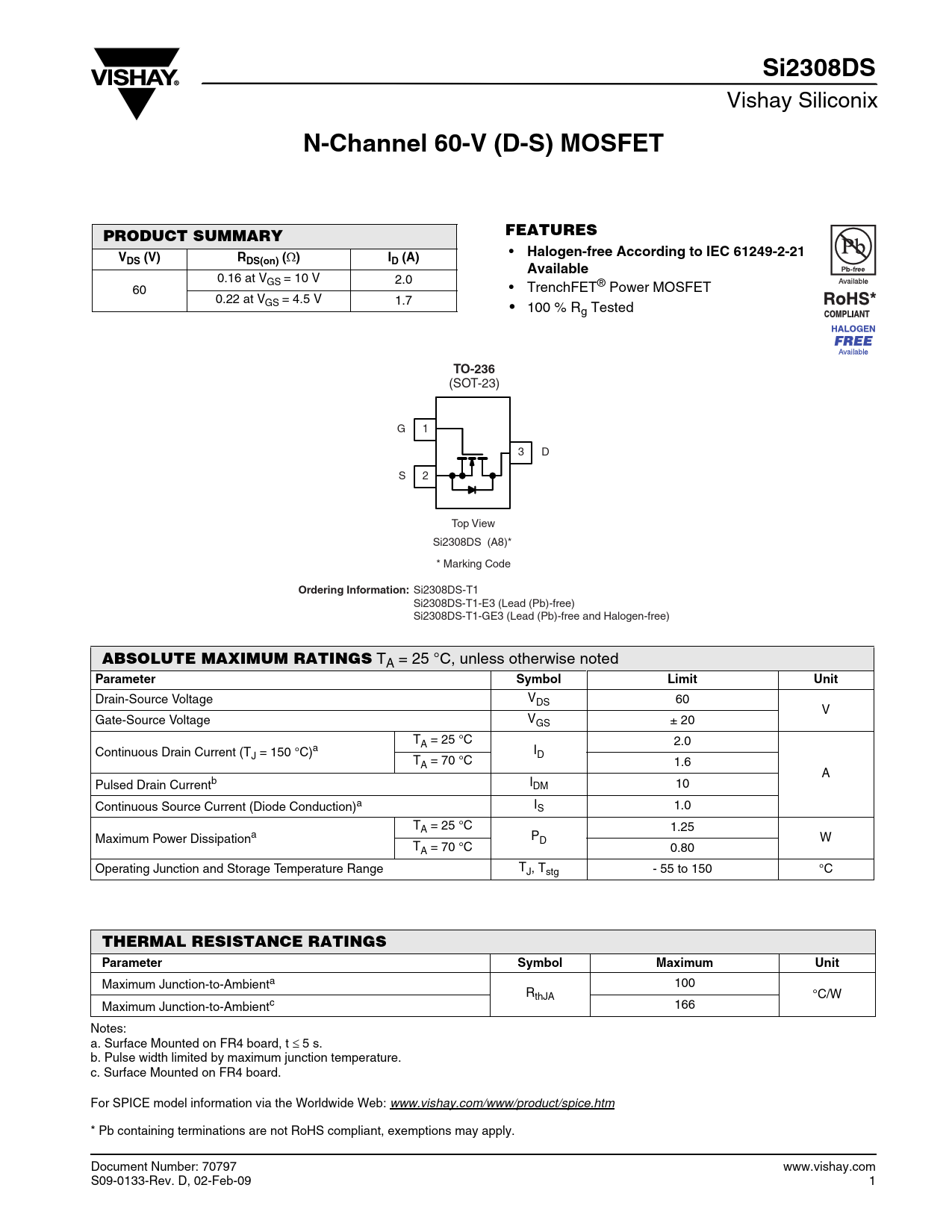 Si2308DS Vishay Siliconix N-Channel 60-V (D-S) MOSFETFEATURESPRODUCT SUMMARY • Halogen-free According to IEC 61249-2-21VDS (V)RDS(on) ( Ω )ID (A)Available 0.16 at VGS = 10 V 2.0 60 • TrenchFET® Power MOSFET 0.22 at VGS = 4.5 V 1.7 • 100 % Rg Tested TO-236 (SOT-23) G 1 3 D S 2 Top View Si2308DS (A8)* * Marking Code Ordering Information: Si2308DS-T1 Si2308DS-T1-E3 (Lead (Pb)-free) Si2308DS-T1-GE3 (Lead (Pb)-free and Halogen-free) ABSOLUTE MAXIMUM RATINGS TA = 25 °C, unless otherwise noted Parameter SymbolLimitUnit Drain-Source Voltage VDS 60 V Gate-Source Voltage VGS ± 20 TA = 25 °C 2.0 Continuous Drain Current (T I J = 150 °C)a D TA = 70 °C 1.6 A Pulsed Drain Currentb IDM 10 Continuous Source Current (Diode Conduction)a IS 1.0 TA = 25 °C 1.25 Maximum Power Dissipationa PD W TA = 70 °C 0.80 Operating Junction and Storage Temperature Range TJ, Tstg - 55 to 150 °C THERMAL RESISTANCE RATINGSParameter SymbolMaximumUnit Maximum Junction-to-Ambienta 100 RthJA °C/W Maximum Junction-to-Ambientc 166 Notes: a. Surface Mounted on FR4 board, t ≤ 5 s. b. Pulse width limited by maximum junction temperature. c. Surface Mounted on FR4 board. For SPICE model information via the Worldwide Web: www.vishay.com/www/product/spice.htm * Pb containing terminations are not RoHS compliant, exemptions may apply. Document Number: 70797 www.vishay.com S09-0133-Rev. D, 02-Feb-09 1