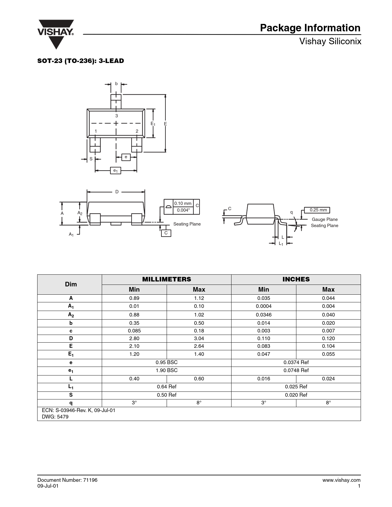 Package Information. SOT-23 (TO-236): 3-LEAD. MILLIMETERS. INCHES. Dim. Min. Max