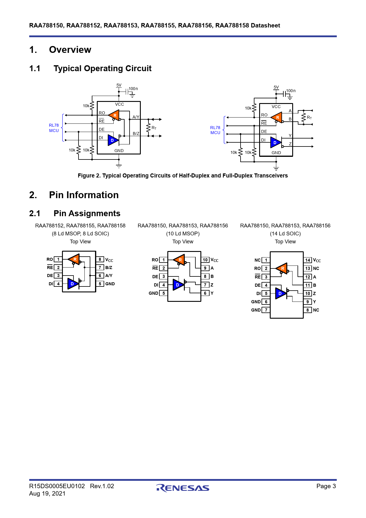R15DS0005EU0102 Rev.1.02 Page 3 Aug 19, 2021 Document Outline Features Applications Contents 1. Overview 1.1 Typical Operating Circuit 2. Pin Information 2.1 Pin Assignments 2.2 Pin Descriptions 3. Specifications 3.1 Absolute Maximum Ratings 3.2 Recommended Operating Conditions 3.3 Thermal Information 3.4 Electrical Specifications 4. Test Circuits and Waveforms 5. Typical Performance Curves 6. Device Description 6.1 Overview 6.2 Functional Block Diagram 6.3 Operating Modes 6.3.1 Driver Operation 6.3.2 Receiver Operation 6.4 Device Features 6.4.1 Large Output Signal Swing 6.4.2 Driver Overload Protection 6.4.3 Full-Failsafe Receiver 6.4.4 Low Current Shutdown Mode 6.4.5 Hot Plug Function 6.4.6 High EFT Immunity 6.4.7 High ESD Protection 7. Application Information 7.1 Network Design 7.1.1 Cable Type 7.1.2 Cable Length vs Data Rate 7.1.3 Topologies and Stub Lengths 7.1.4 Minimum Distance between Nodes 7.1.5 Failsafe Biasing Termination 7.2 Transient Protection 7.3 Layout Guidelines 7.3.1 Layout Example 8. Package Outline Drawings 9. Ordering Information 10. Revision History