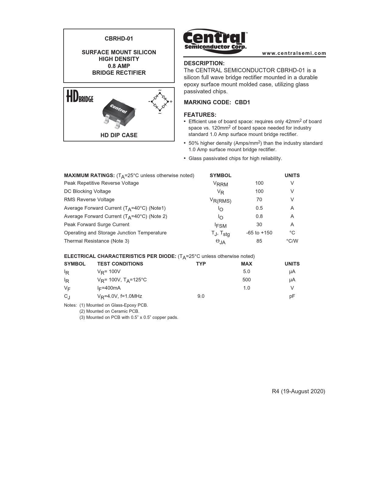 CBRHD-01SURFACE MOUNT SILICONwww.centra lsemi.comHIGH DENSITY0.8 AMPDESCRIPTION:BRIDGE RECTIFIER The CENTRAL SEMICONDUCTOR CBRHD-01 is a silicon full wave bridge rectifier mounted in a durable epoxy surface mount molded case, utilizing glass passivated chips. MARKING CODE: CBD1FEATURES:• Efficient use of board space: requires only 42mm2 of board space vs. 120mm2 of board space needed for industry standard 1.0 Amp surface mount bridge rectifier. HD DIP CASE• 50% higher density (Amps/mm2) than the industry standard 1.0 Amp surface mount bridge rectifier. • Glass passivated chips for high reliability. MAXIMUM RATINGS: (TA=25°C unless otherwise noted) SYMBOLUNITS Peak Repetitive Reverse Voltage VRRM 100 V DC Blocking Voltage VR 100 V RMS Reverse Voltage VR(RMS) 70 V Average Forward Current (TA=40°C) (Note1) IO 0.5 A Average Forward Current (TA=40°C) (Note 2) IO 0.8 A Peak Forward Surge Current IFSM 30 A Operating and Storage Junction Temperature TJ, Tstg -65 to +150 °C Thermal Resistance (Note 3) ΘJA 85 °C/W ELECTRICAL CHARACTERISTICS PER DIODE: (TA=25°C unless otherwise noted) SYMBOL TESTCONDITIONSTYPMAXUNITS IR VR= 100V 5.0 µA IR VR= 100V, TA=125°C 500 µA VF IF=400mA 1.0 V CJ VR=4.0V, f=1.0MHz 9.0 pF Notes: (1) Mounted on Glass-Epoxy PCB. (2) Mounted on Ceramic PCB. (3) Mounted on PCB with 0.5” x 0.5” copper pads. R4 (19-August 2020)