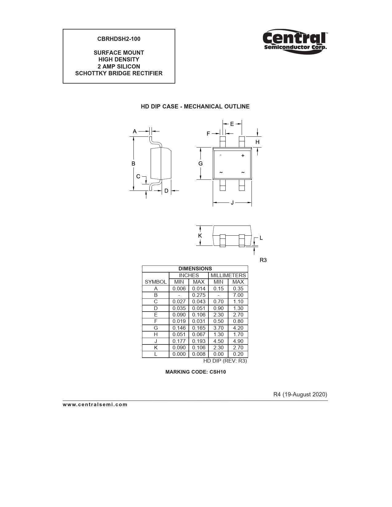 CBRHDSH2-100. SURFACE MOUNT. HIGH DENSITY. 2 AMP SILICON. SCHOTTKY BRIDGE RECTIFIER. HD DIP CASE - MECHANICAL OUTLINE. DIMENSIONS