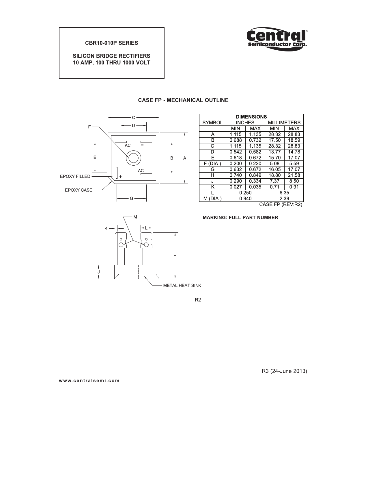 CBR10-010P SERIES. SILICON BRIDGE RECTIFIERS 10 AMP, 100 THRU 1000 VOLT. CASE FP - MECHANICAL OUTLINE