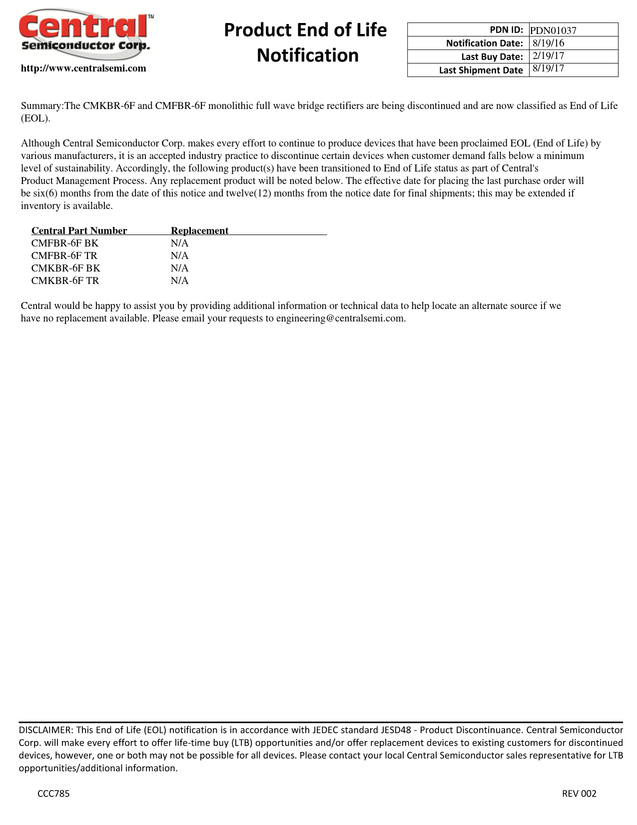 PDN01037 8/19/16 2/19/17 http://www.centralsemi.com 8/19/17 Summary:The CMKBR-6F and CMFBR-6F monolithic full wave bridge rectifiers are being discontinued and are now classified as End of Life (EOL). Although Central Semiconductor Corp. makes every effort to continue to produce devices that have been proclaimed EOL (End of Life) by various manufacturers, it is an accepted industry practice to discontinue certain devices when customer demand falls below a minimum level of sustainability. Accordingly, the following product(s) have been transitioned to End of Life status as part of Central's Product Management Process. Any replacement product will be noted below. The effective date for placing the last purchase order will be six(6) months from the date of this notice and twelve(12) months from the notice date for final shipments; this may be extended if inventory is available. Central Part Number _________________________ Replacement _________________________ CMFBR-6F BK N/A CMFBR-6F TR N/A CMKBR-6F BK N/A CMKBR-6F TR N/A Central would be happy to assist you by providing additional information or technical data to help locate an alternate source if we have no replacement available. Please email your requests to engineering@centralsemi.com.