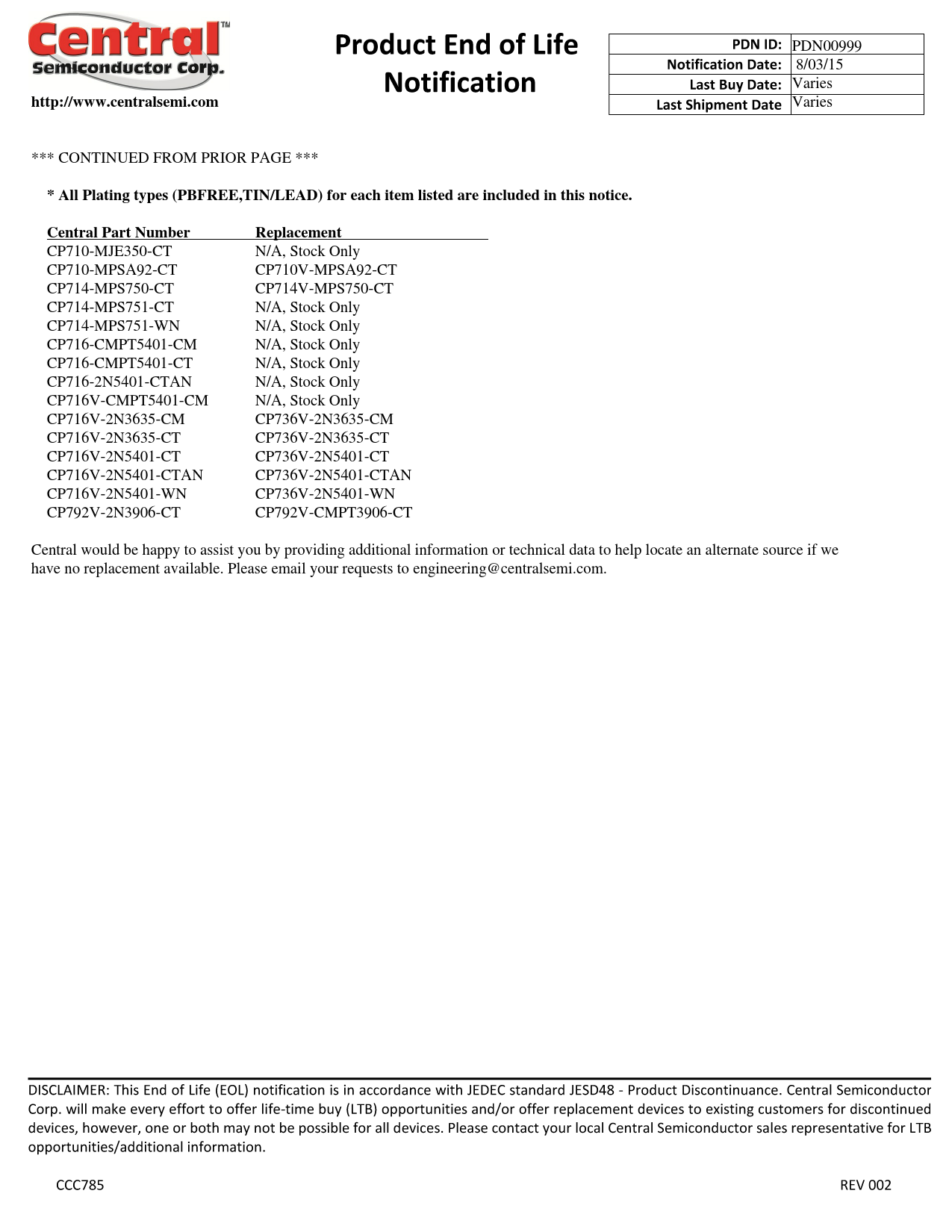 http://www.centralsemi.com. * All Plating types (PBFREE,TIN/LEAD) for each item listed are included in this notice