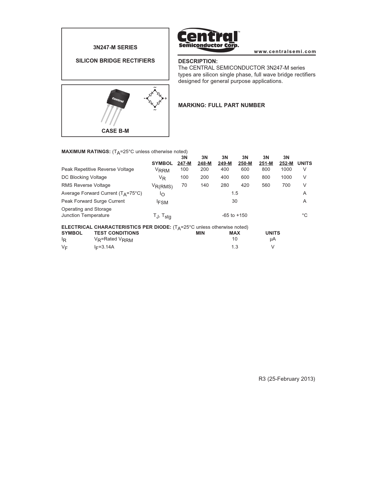 3N247-M SERIES. w w w. c e n t r a l s e m i . c o m. SILICON BRIDGE RECTIFIERS. DESCRIPTION:. MARKING: FULL PART NUMBER