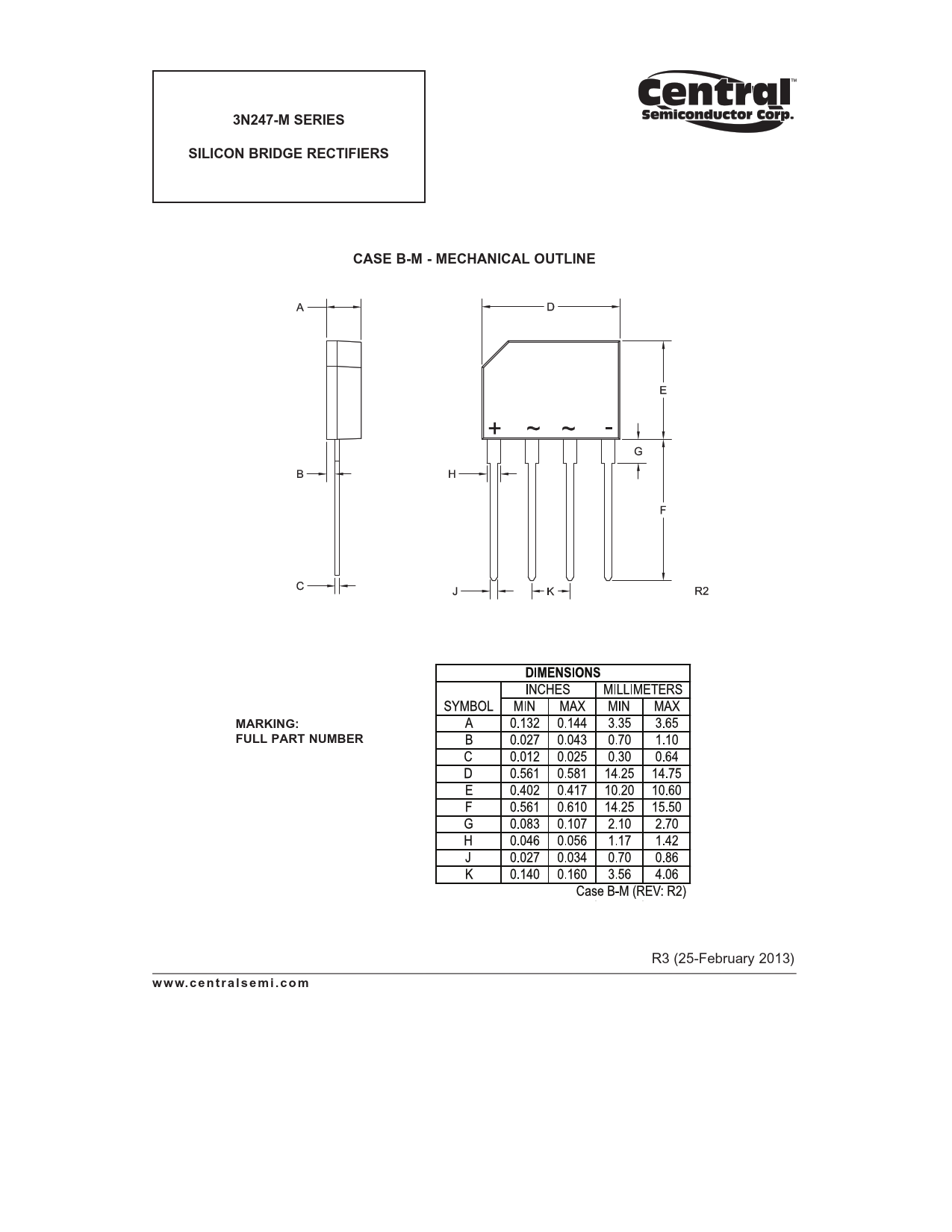 Línea de modelo para esta hoja de datos Versión de texto del documento 3N247-M SERIES SILICON BRIDGE RECTIFIERS CASE B-M - MECHANICAL OUTLINE MARKING: FULL PART NUMBER R3 (25-February 2013)w w w. c e n t r a l s e m i . c o m
