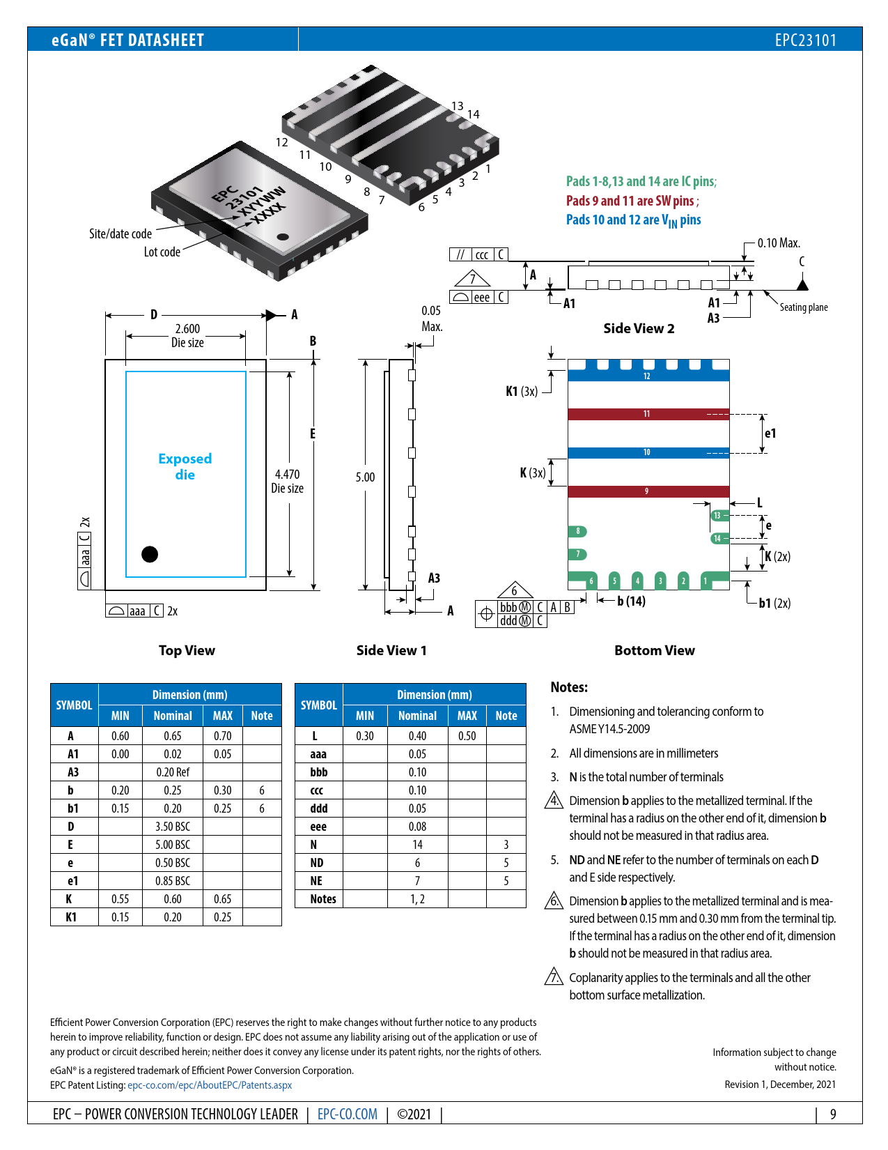 eGaN® FET DATASHEET. Pads 1-8,13 and 14 are IC pins. EPC. 23101. Pads 9 and 11 are SW. XYYWW. pins. XXXX. Pads 10 and 12 are VIN pins