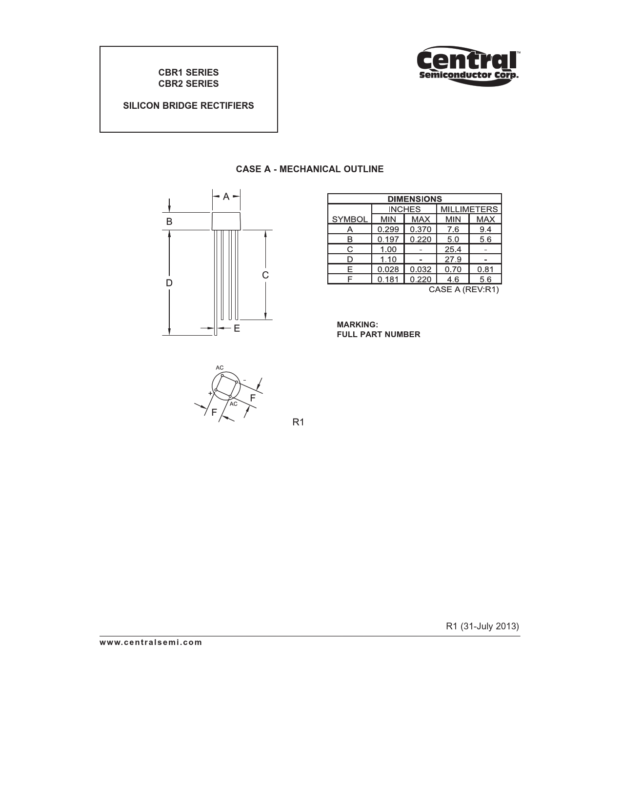 Línea de modelo para esta hoja de datos Versión de texto del documento CBR1 SERIES CBR2 SERIES SILICON BRIDGE RECTIFIERS CASE A - MECHANICAL OUTLINE MARKING: FULL PART NUMBER R1 (31-July 2013)w w w. c e n t r a l s e m i . c o m