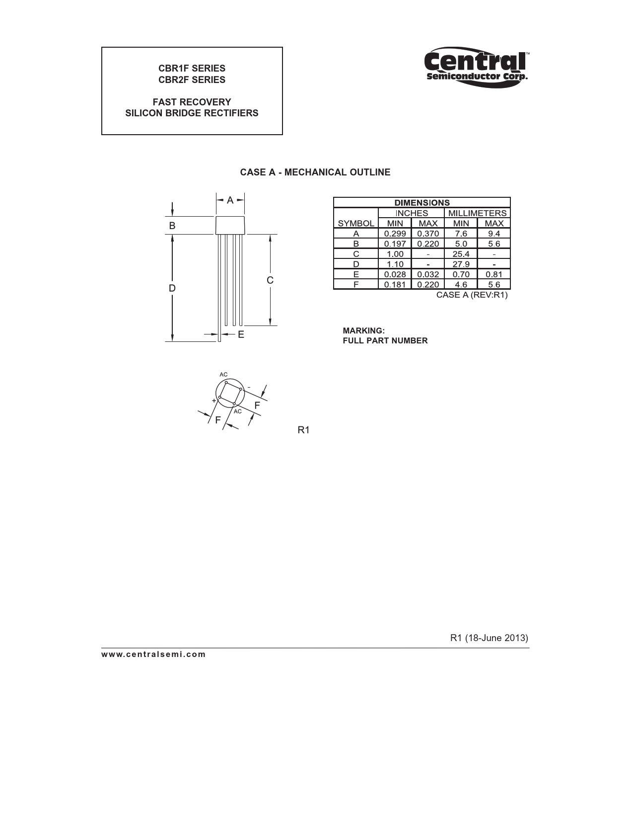 CBR1F SERIES CBR2F SERIES. FAST RECOVERY. SILICON BRIDGE RECTIFIERS. CASE A - MECHANICAL OUTLINE. MARKING: FULL PART NUMBER