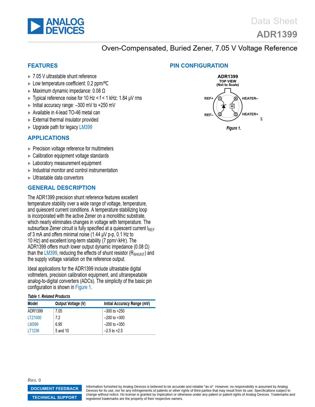 ADR1399. FEATURES. PIN CONFIGURATION. Figure 1. APPLICATIONS. GENERAL DESCRIPTION. Table 1. Related Products. Model. Output Voltage (V)