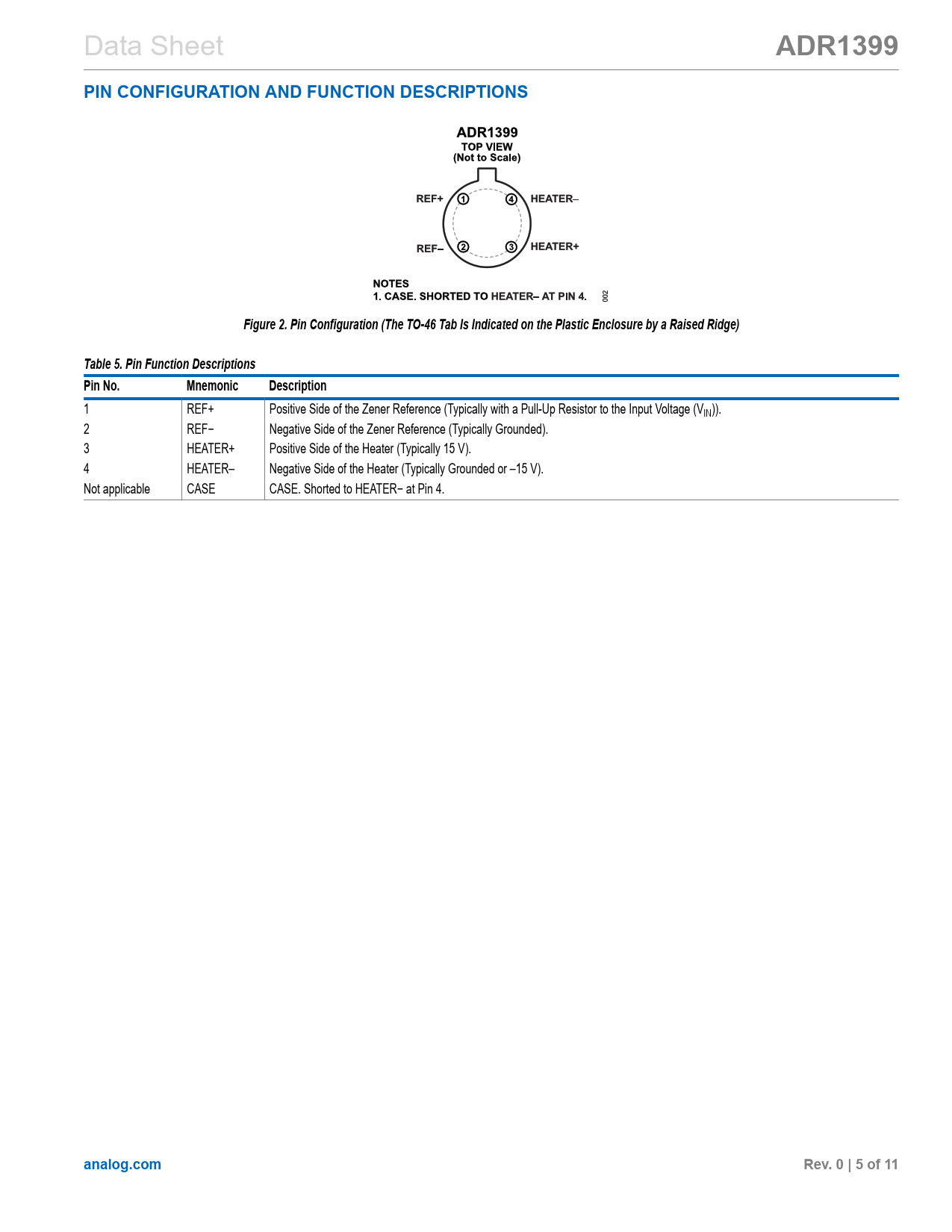 Data Sheet ADR1399PIN CONFIGURATION AND FUNCTION DESCRIPTIONSFigure 2. Pin Configuration (The TO-46 Tab Is Indicated on the Plastic Enclosure by a Raised Ridge)Table 5. Pin Function DescriptionsPin No.MnemonicDescription 1 REF+ Positive Side of the Zener Reference (Typically with a Pull-Up Resistor to the Input Voltage (VIN)). 2 REF− Negative Side of the Zener Reference (Typically Grounded). 3 HEATER+ Positive Side of the Heater (Typically 15 V). 4 HEATER– Negative Side of the Heater (Typically Grounded or –15 V). Not applicable CASE CASE. Shorted to HEATER− at Pin 4. analog.comRev. 0 | 5 of 11 Document Outline Features Applications Pin Configuration General Description Specifications Electrical Characteristics Absolute Maximum Ratings Thermal Resistance ESD Caution Pin Configuration and Function Descriptions Typical Performance Characteristics Theory of Operation Operating Set Temperature Thermal Resistance Applications Information Avoiding Thermocouple Errors Shunt Dynamic Impedance and Capacitive Load Typical Applications Outline Dimensions Ordering Guide