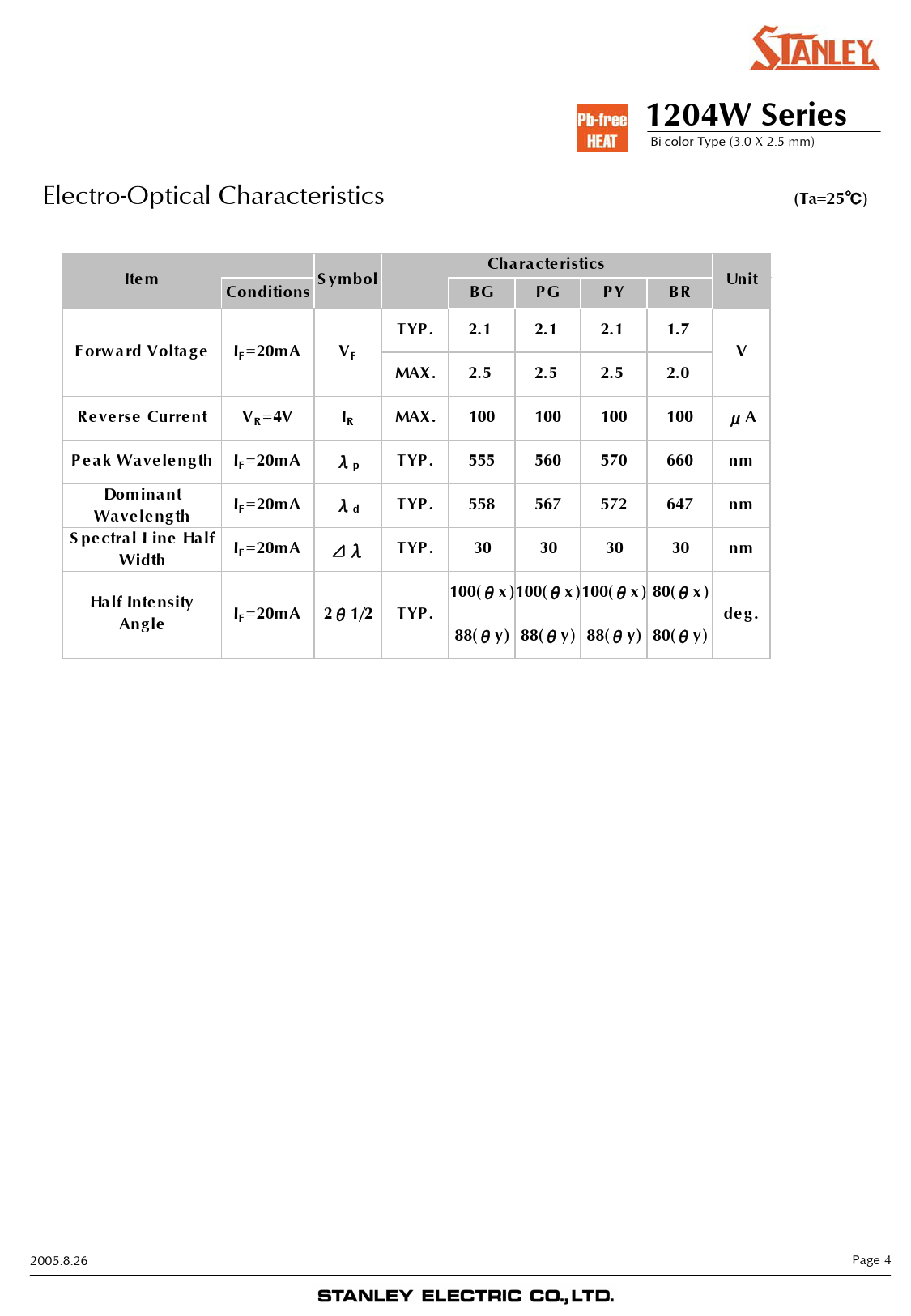 1204W Series Bi-color Type (3.0 X 2.5 mm) Electro-Optical Characteristics (Ta=25 ℃ )Cha ra cte risticsIte mS ymbolUnitConditionsBGP GP YBRT YP .2.12.12.11.7F orwa rd Volta g eIF =20mAVFVMAX .2.52.52.52.0Re ve rse Curre ntVR =4VIRMAX .100100100100 μ AP e a k Wa ve le ngthIF =20mA λ pT YP .555560570660nmDomina ntIWa ve le ng thF =20m A λ dT YP .558567572647nmS pe ctra l L ine Ha lfIWidthF =20m A ⊿λ T YP .30303030nm100( θ x )100( θ x )100( θ x ) 80( θ x )Ha lf Inte nsityIF =20mA2 θ 1/2T YP .de g .Angle88( θ y) 88( θ y) 88( θ y) 80( θ y) 2005.8.26 Page 4 Document Outline スライド番号 1 スライド番号 2 スライド番号 3 スライド番号 4 スライド番号 5 スライド番号 6 スライド番号 7 スライド番号 8 スライド番号 9 スライド番号 10 スライド番号 11 スライド番号 12 スライド番号 13 スライド番号 14