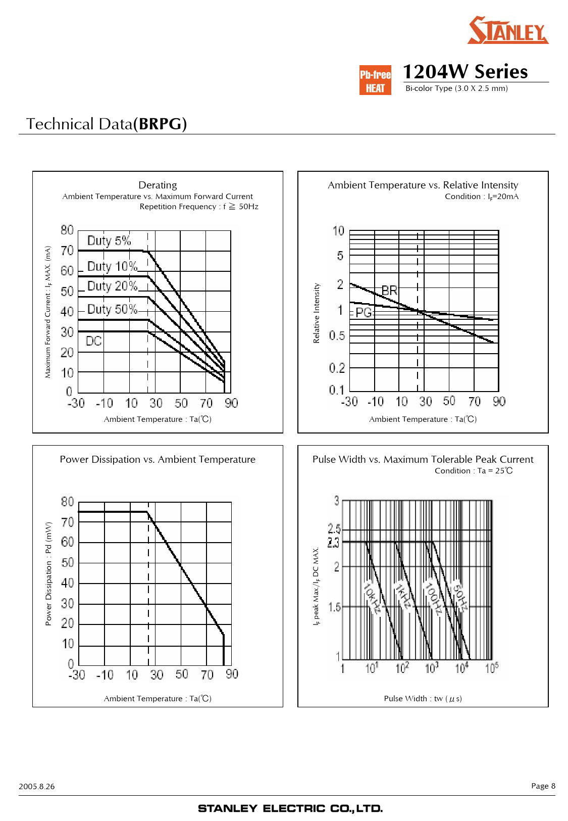 Derating Ambient Temperature vs. Relative Intensity Ambient Temperature vs. Maximum Forward Current Condition : I =20mA F Repetition Frequency : f ≧ 50Hz A) m MAX. ( F y it ntens ive I ard Current : I rw o Relat m F u xim Ma Ambient Temperature : Ta(℃) Ambient Temperature : Ta(℃) Power Dissipation vs. Ambient Temperature Pulse Width vs. Maximum Tolerable Peak Current Condition : Ta = 25℃ W) (m MAX. ation : Pd DC I F sip x./ Dis ak Ma pe Power I F Ambient Temperature : Ta(℃) Pulse Width : tw (μs) 2005.8.26 Page 8 Document Outline スライド番号 1 スライド番号 2 スライド番号 3 スライド番号 4 スライド番号 5 スライド番号 6 スライド番号 7 スライド番号 8 スライド番号 9 スライド番号 10 スライド番号 11 スライド番号 12 スライド番号 13 スライド番号 14