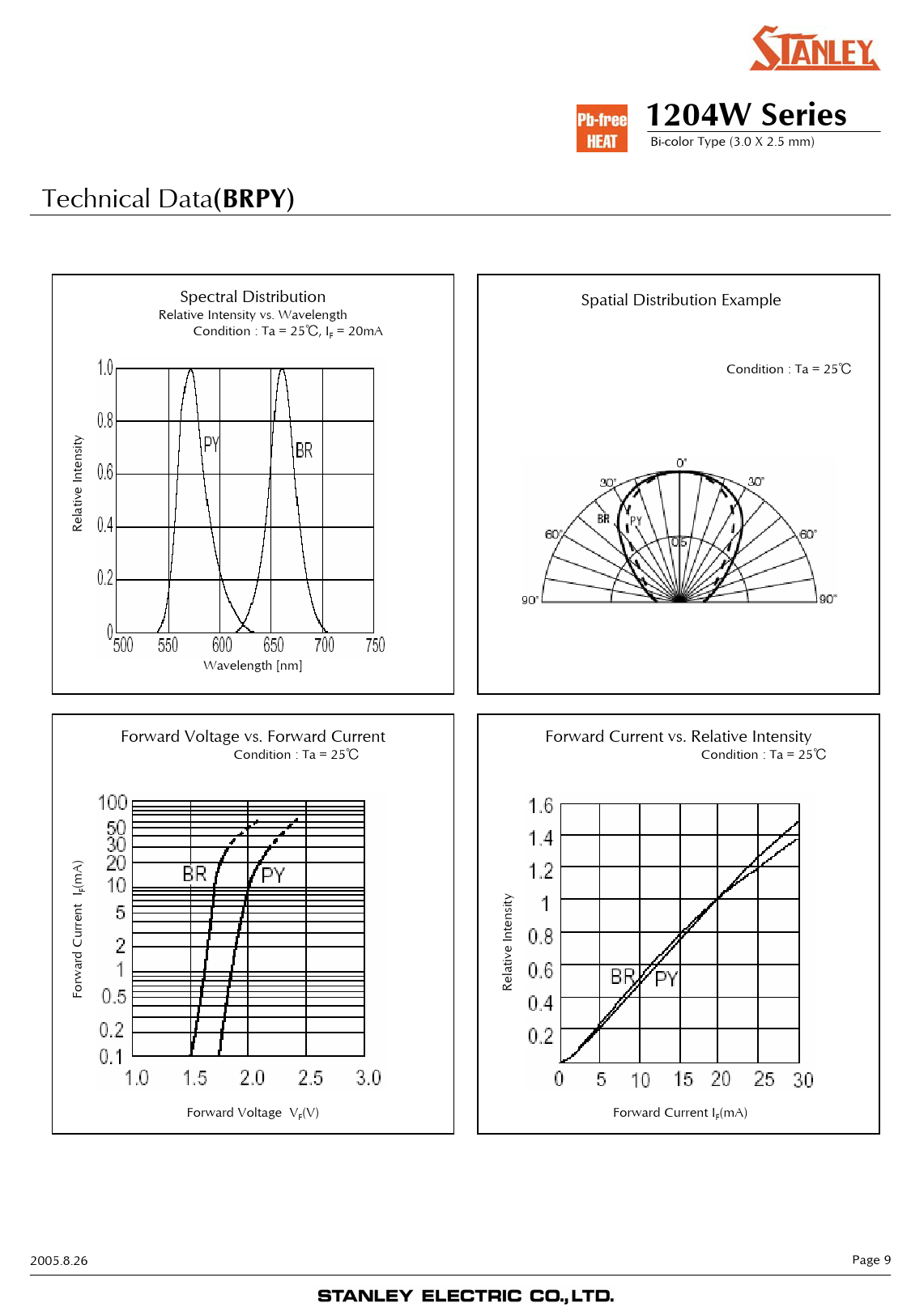 1204W Series Bi-color Type (3.0 X 2.5 mm) Technical Data (BRPY) Spectral Distribution Spatial Distribution Example Relative Intensity vs. Wavelength Condition : Ta = 25℃, I = 20mA F Condition : Ta = 25℃ y it ntens ive I Relat Wavelength [nm] Forward Voltage vs. Forward Current Forward Current vs. Relative Intensity Condition : Ta = 25℃ Condition : Ta = 25℃ (mA) F I y it nt rre u ntens d C ive I ar Relat Forw Forward Voltage V (V) Forward Current I (mA) F F 2005.8.26 Page 9 Document Outline スライド番号 1 スライド番号 2 スライド番号 3 スライド番号 4 スライド番号 5 スライド番号 6 スライド番号 7 スライド番号 8 スライド番号 9 スライド番号 10 スライド番号 11 スライド番号 12 スライド番号 13 スライド番号 14