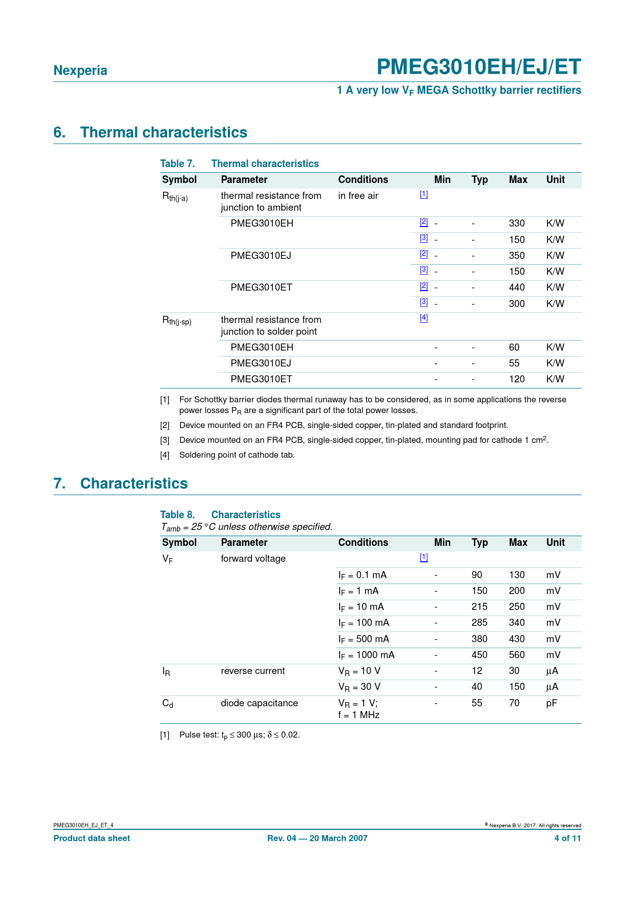 Nexperia. PMEG3010EH/EJ/ET. 1 A very low VF MEGA Schottky barrier rectifiers. Thermal characteristics. Table 7. Symbol. Parameter