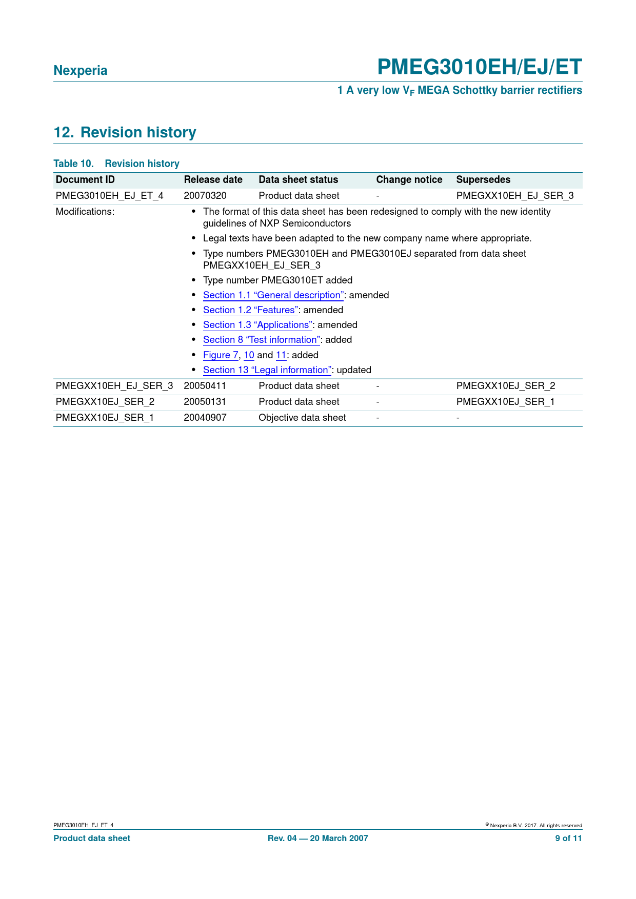 Nexperia. PMEG3010EH/EJ/ET. 1 A very low VF MEGA Schottky barrier rectifiers. 12. Revision history. Table 10. Revision history