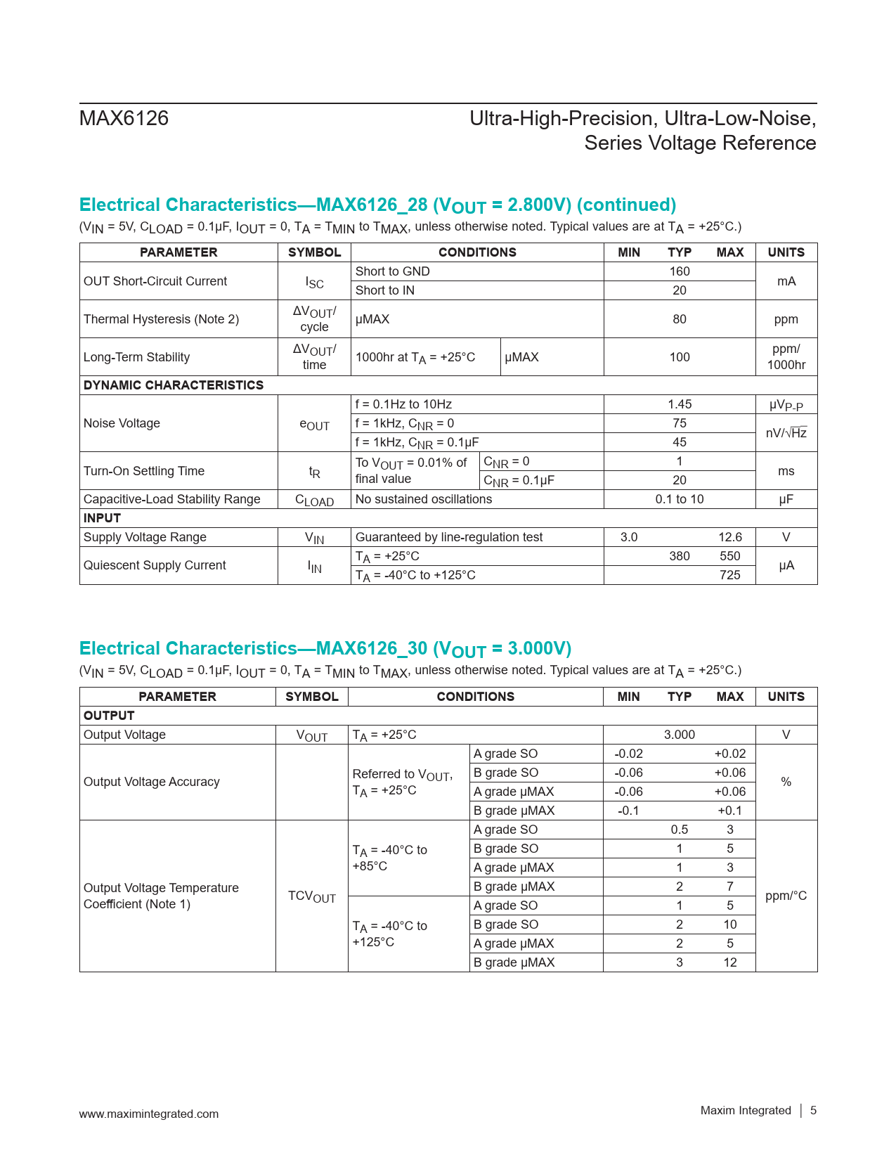 MAX6126 Ultra-High-Precision, Ultra-Low-Noise, Series Voltage Reference Electrical Characteristics—MAX6126_28 (VOUT = 2.800V) (continued) (VIN = 5V, CLOAD = 0.1μF, IOUT = 0, TA = TMIN to TMAX, unless otherwise noted. Typical values are at TA = +25°C.) PARAMETERSYMBOLCONDITIONSMINTYPMAXUNITS Short to GND 160 OUT Short-Circuit Current ISC mA Short to IN 20 Thermal Hysteresis (Note 2) ΔVOUT/ cycle µMAX 80 ppm Long-Term Stability ΔVOUT/ time 1000hr at TA = +25°C µMAX 100 ppm/ 1000hr DYNAMIC CHARACTERISTICS f = 0.1Hz to 10Hz 1.45 µVP-P Noise Voltage eOUT f = 1kHz, CNR = 0 75 nV/√Hz f = 1kHz, CNR = 0.1µF 45 C Turn-On Settling Time t To VOUT = 0.01% of NR = 0 1 R final value ms CNR = 0.1µF 20 Capacitive-Load Stability Range CLOAD No sustained oscillations 0.1 to 10 µF INPUT Supply Voltage Range VIN Guaranteed by line-regulation test 3.0 12.6 V T Quiescent Supply Current I A = +25°C 380 550 IN µA TA = -40°C to +125°C 725 Electrical Characteristics—MAX6126_30 (VOUT = 3.000V) (VIN = 5V, CLOAD = 0.1μF, IOUT = 0, TA = TMIN to TMAX, unless otherwise noted. Typical values are at TA = +25°C.) PARAMETERSYMBOLCONDITIONSMINTYPMAXUNITSOUTPUT Output Voltage VOUT TA = +25°C 3.000 V A grade SO -0.02 +0.02 B grade SO -0.06 +0.06 Output Voltage Accuracy Referred to VOUT, T % A = +25°C A grade µMAX -0.06 +0.06 B grade µMAX -0.1 +0.1 A grade SO 0.5 3 TA = -40°C to B grade SO 1 5 +85°C A grade µMAX 1 3 Output Voltage Temperature B grade µMAX 2 7 Coefficient (Note 1) TCVOUT ppm/°C A grade SO 1 5 TA = -40°C to B grade SO 2 10 +125°C A grade µMAX 2 5 B grade µMAX 3 12 www.maximintegrated.com Maxim Integrated │ 5