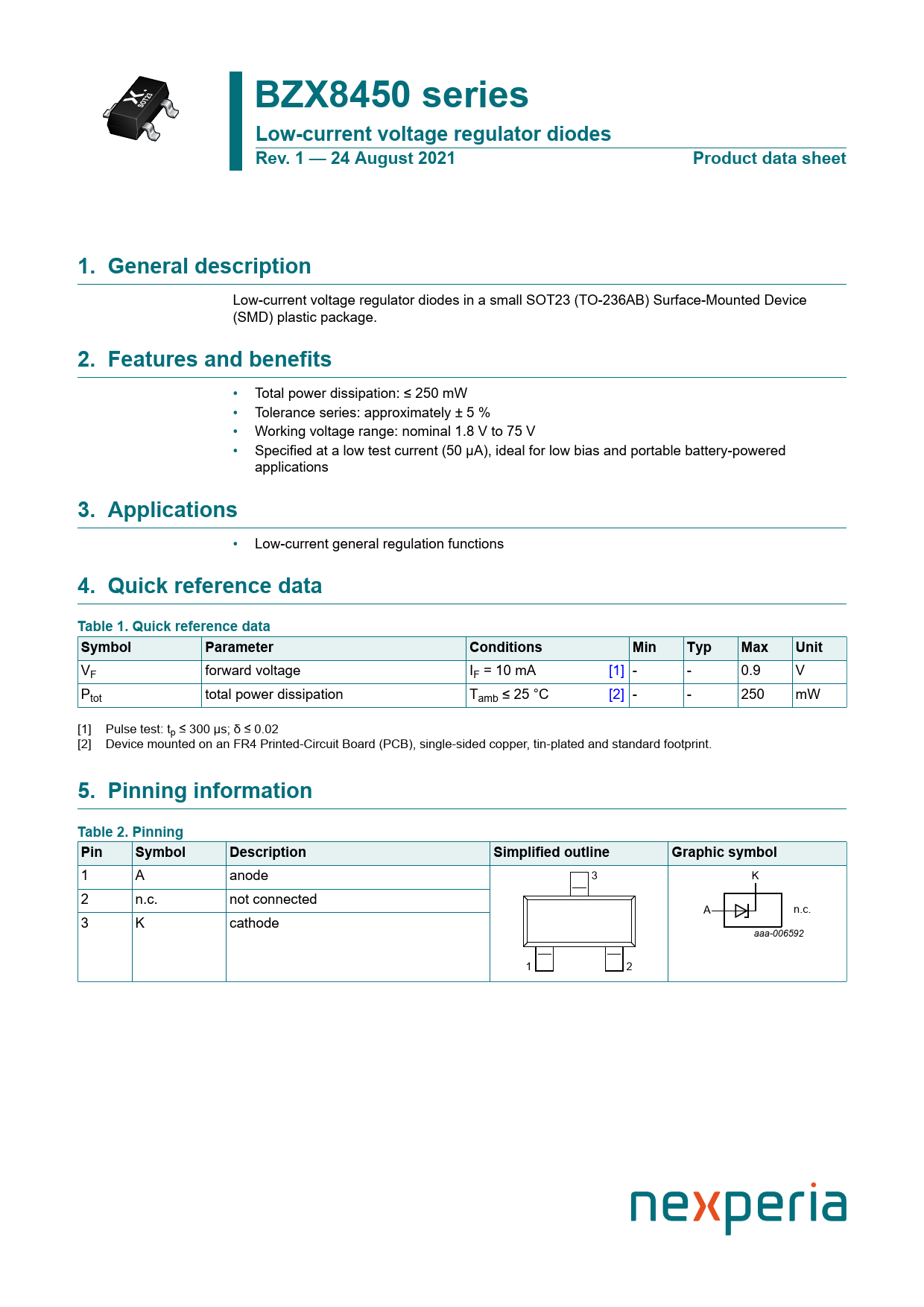 link to page 1 link to page 1 BZX8450 seriesLow-current voltage regulator diodesRev. 1 — 24 August 2021Product data sheet1. General description Low-current voltage regulator diodes in a smal SOT23 (TO-236AB) Surface-Mounted Device (SMD) plastic package. 2. Features and benefits • Total power dissipation: ≤ 250 mW • Tolerance series: approximately ± 5 % • Working voltage range: nominal 1.8 V to 75 V • Specified at a low test current (50 μA), ideal for low bias and portable battery-powered applications 3. Applications • Low-current general regulation functions 4. Quick reference data Table 1. Quick reference dataSymbolParameterConditionsMinTypMaxUnit VF forward voltage IF = 10 mA [1] - - 0.9 V Ptot total power dissipation Tamb ≤ 25 °C [2] - - 250 mW [1] Pulse test: tp ≤ 300 μs; δ ≤ 0.02 [2] Device mounted on an FR4 Printed-Circuit Board (PCB), single-sided copper, tin-plated and standard footprint. 5. Pinning information Table 2. PinningPinSymbolDescriptionSimplified outlineGraphic symbol 1 A anode 3 K 2 n.c. not connected A n.c. 3 K cathode aaa-006592 1 2 Document Outline 1. General description 2. Features and benefits 3. Applications 4. Quick reference data 5. Pinning information 6. Ordering information 7. Marking 8. Limiting values 9. Thermal characteristics 10. Characteristics 11. Package outline 12. Soldering 13. Revision history 14. Legal information Contents