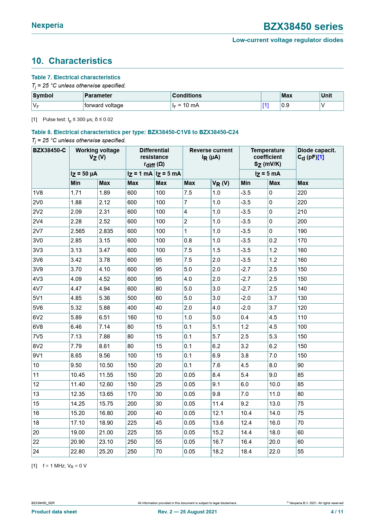 1V8 1.71 1.89 600 100 7.5 1.0 -3.5 0 220 2V0 1.88 2.12 600 100 7 1.0 -3.5 0 220 2V2 2.09 2.31 600 100 4 1.0 -3.5 0 210 2V4 2.28 2.52 600 100 2 1.0 -3.5 0 200 2V7 2.565 2.835 600 100 1 1.0 -3.5 0 190 3V0 2.85 3.15 600 100 0.8 1.0 -3.5 0.2 170 3V3 3.13 3.47 600 100 7.5 1.5 -3.5 1.2 160 3V6 3.42 3.78 600 95 7.5 2.0 -3.5 1.2 160 3V9 3.70 4.10 600 95 5.0 2.0 -2.7 2.5 150 4V3 4.09 4.52 600 95 4.0 2.0 -2.7 2.5 150 4V7 4.47 4.94 600 80 5.0 3.0 -2.7 2.5 140 5V1 4.85 5.36 500 60 5.0 3.0 -2.0 3.7 130 5V6 5.32 5.88 400 40 2.0 4.0 -2.0 3.7 120 6V2 5.89 6.51 160 10 1.0 5.0 0.4 4.5 110 6V8 6.46 7.14 80 15 0.1 5.1 1.2 4.5 100 7V5 7.13 7.88 80 15 0.1 5.7 2.5 5.3 150 8V2 7.79 8.61 80 15 0.1 6.2 3.2 6.2 150 9V1 8.65 9.56 100 15 0.1 6.9 3.8 7.0 150 10 9.50 10.50 150 20 0.1 7.6 4.5 8.0 90 11 10.45 11.55 150 20 0.05 8.4 5.4 9.0 85 12 11.40 12.60 150 25 0.05 9.1 6.0 10.0 85 13 12.35 13.65 170 30 0.05 9.8 7.0 11.0 80 15 14.25 15.75 200 30 0.05 11.4 9.2 13.0 75 16 15.20 16.80 200 40 0.05 12.1 10.4 14.0 75 18 17.10 18.90 225 45 0.05 13.6 12.4 16.0 70 20 19.00 21.00 225 55 0.05 15.2 14.4 18.0 60 22 20.90 23.10 250 55 0.05 16.7 16.4 20.0 60 24 22.80 25.20 250 70 0.05 18.2 18.4 22.0 55 [1] f = 1 MHz; VR = 0 V BZX38450_SER All information provided in this document is subject to legal disclaimers. © Nexperia B.V. 2021. Al rights reserved