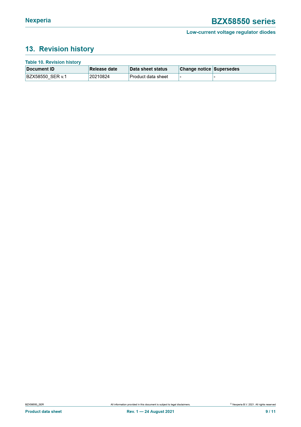 Nexperia BZX58550 series Low-current voltage regulator diodes 13. Revision history Table 10. Revision history Document ID Release date Data sheet status Change notice Supersedes
